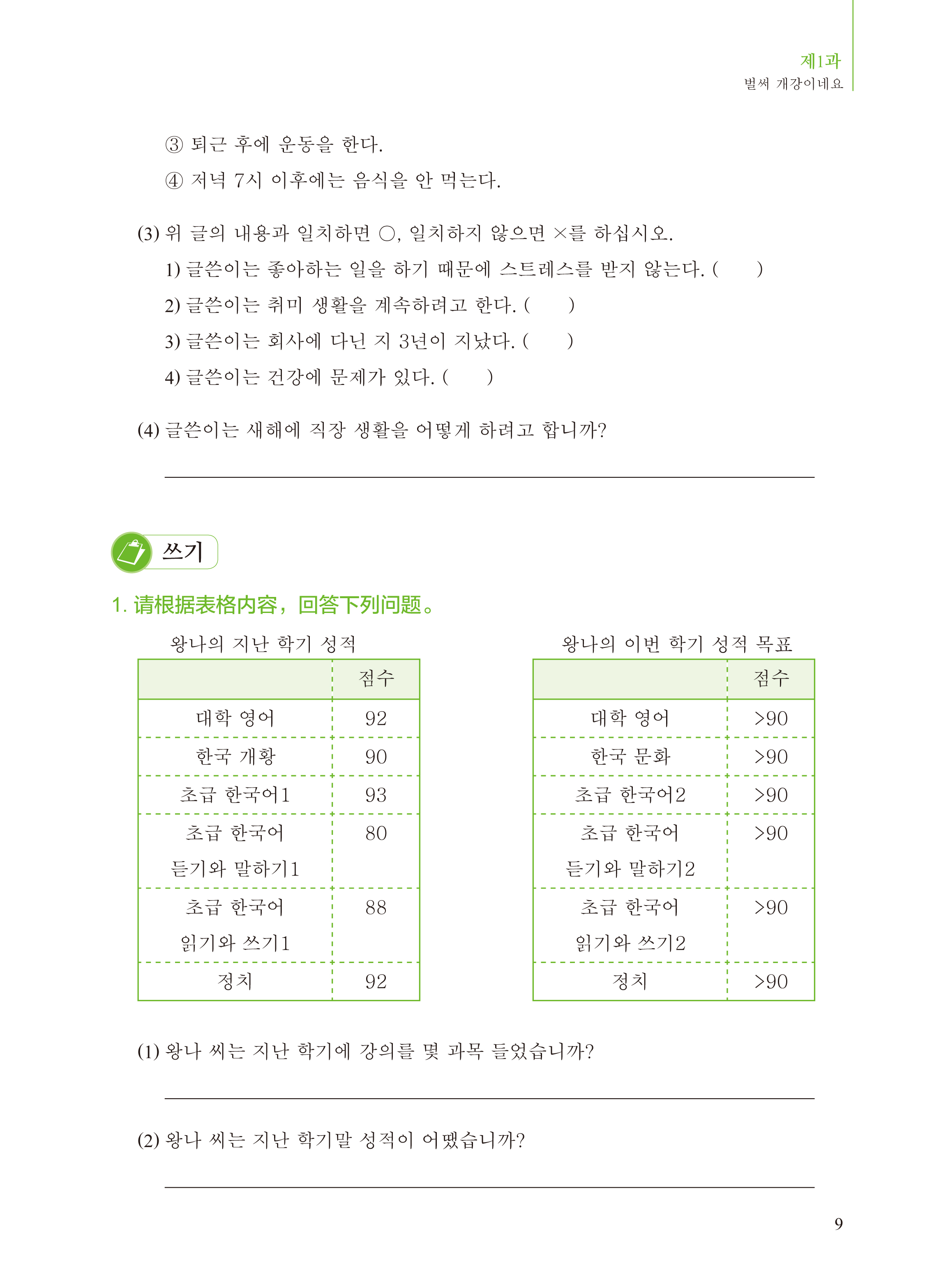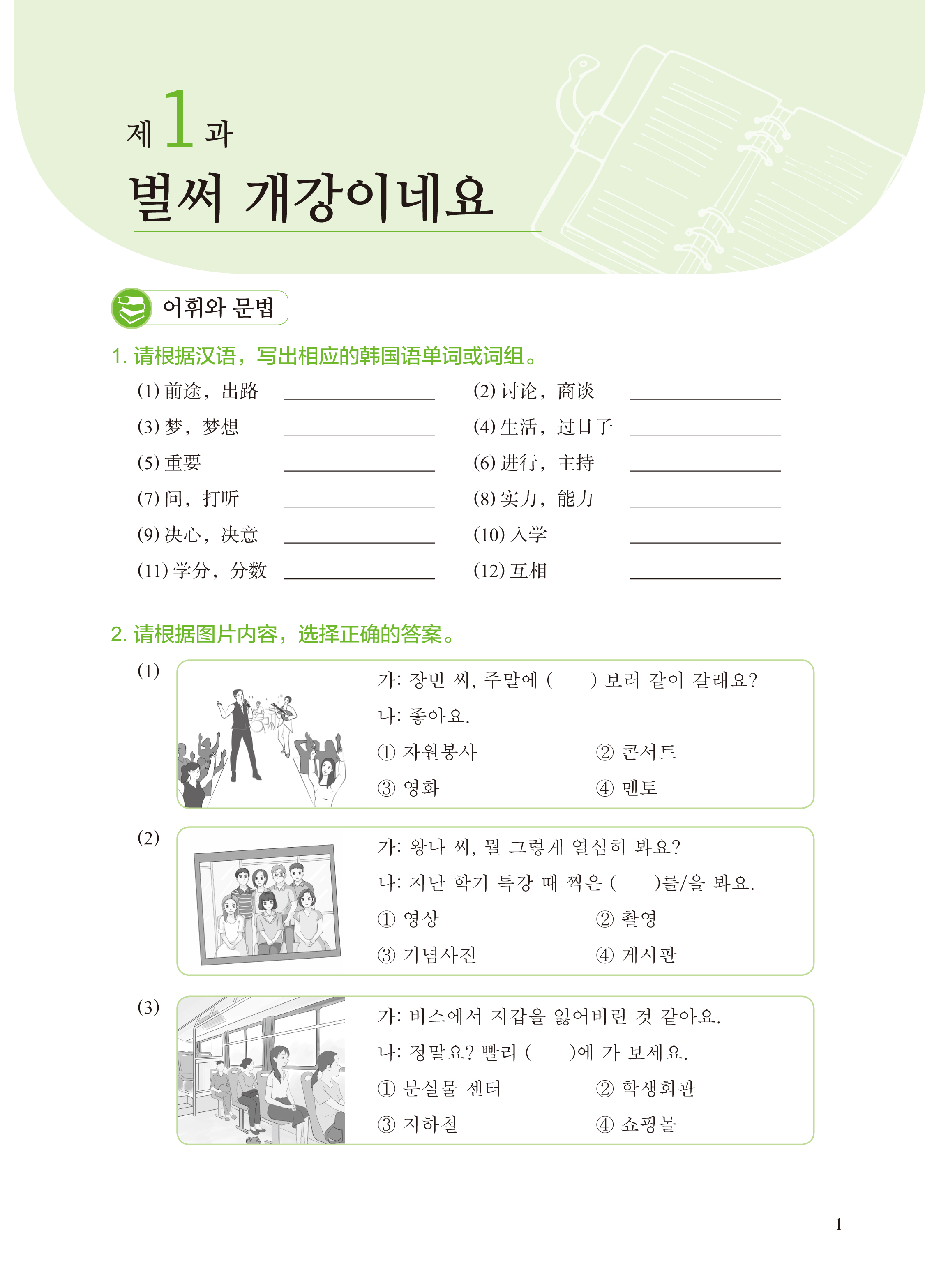 练习册包括15课的课文练习。课文练习着重考查学生对每课出现的词汇、语法点的掌握与运用能力,以及对每课学习目标中所要求的语言知识、社会文化知识与国别知识的掌握情况,分为词汇与语法、听力、阅读、写作、翻译五个模块。词汇与语法练习文本内容丰富、形式多样,让学生在丰富的语境中掌握并巩固词汇和语法的实际用法,提高语言组织能力和理解能力;听力练习的听力文本采用对话和短文的形式, 适当结合听说练习,让学生通过不同形式文本的听力练习提高朝鲜(韩国)语听力理解能力和语言表达能力;阅读练习的文本涵盖了每课的主题和学习目标中要求的知识内容,帮助学生拓展文化视野、提高跨文化意识,同时让学生通过选择、判断、读写有机结合的练习提高朝鲜(韩国)语阅读理解能力;写作练习强调循序渐进、由简到难, 合理安排读写练习,让学生通过所提供的信息写出单词、句子,最终根据自己的情况写出一篇文章;翻译练习为了增强学生的语言转换能力,设有中韩、韩中五个句子的翻译练习,句子中包含每课的重点词汇和语法点。