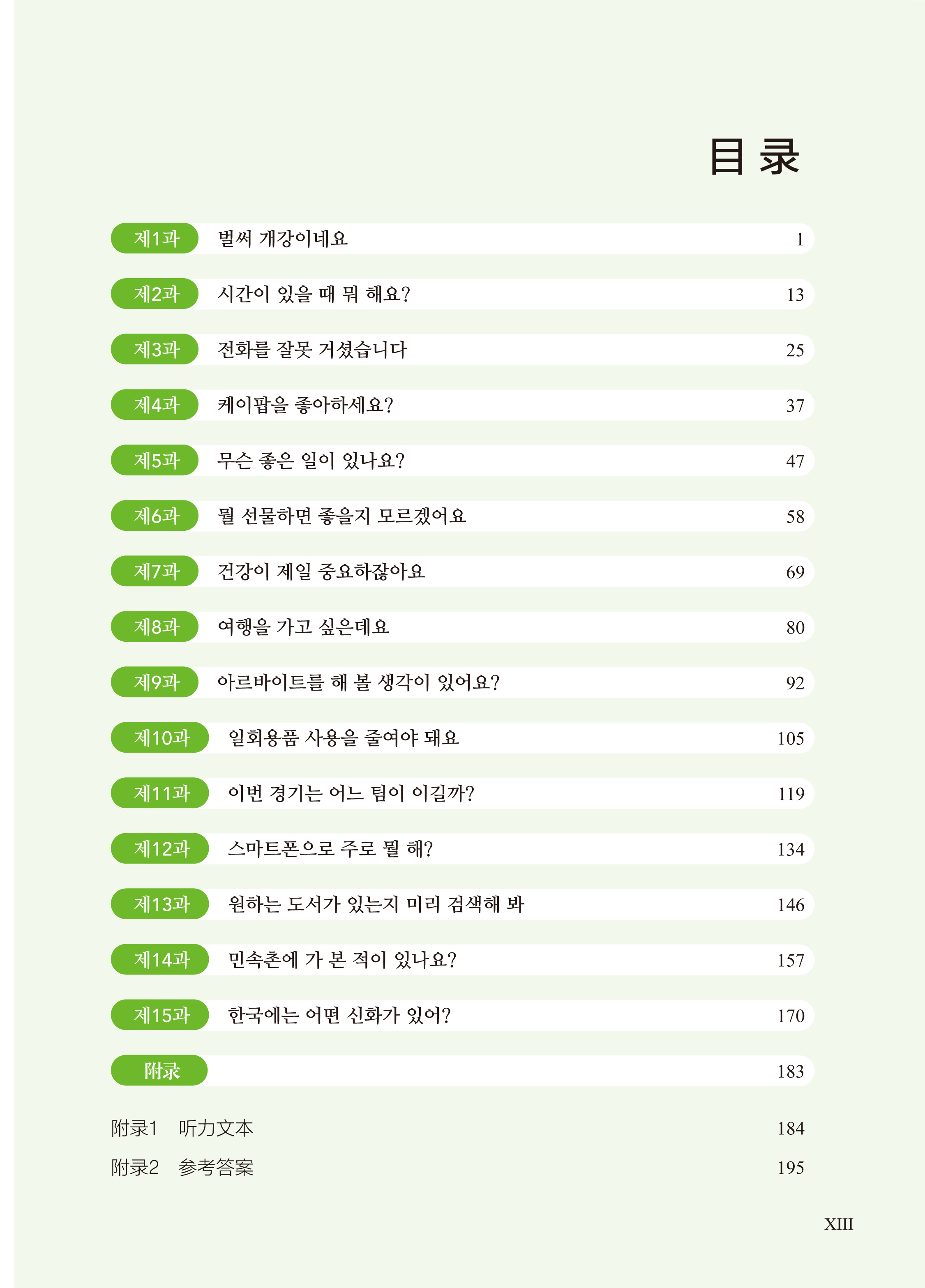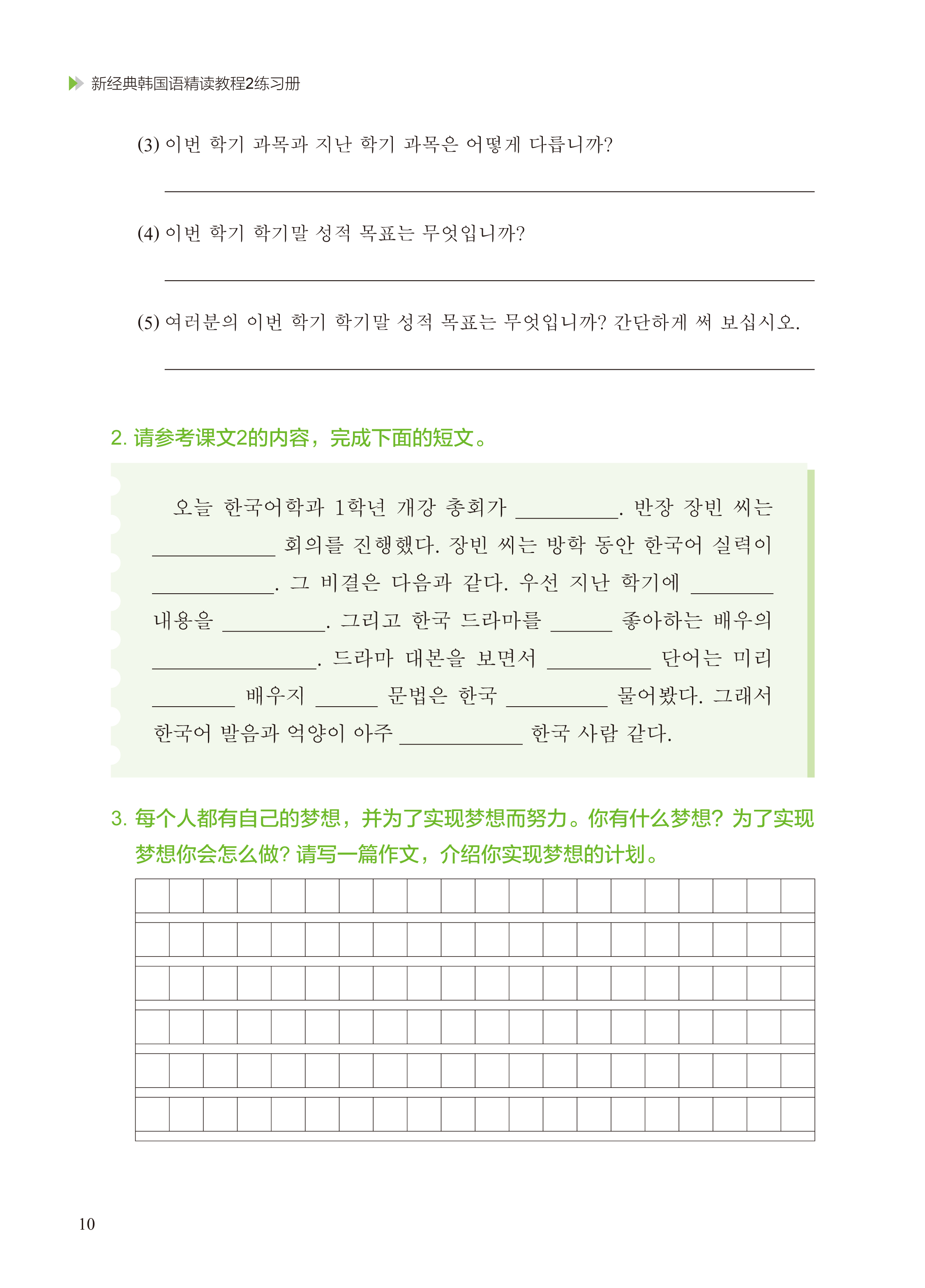 练习册包括15课的课文练习。课文练习着重考查学生对每课出现的词汇、语法点的掌握与运用能力,以及对每课学习目标中所要求的语言知识、社会文化知识与国别知识的掌握情况,分为词汇与语法、听力、阅读、写作、翻译五个模块。词汇与语法练习文本内容丰富、形式多样,让学生在丰富的语境中掌握并巩固词汇和语法的实际用法,提高语言组织能力和理解能力;听力练习的听力文本采用对话和短文的形式, 适当结合听说练习,让学生通过不同形式文本的听力练习提高朝鲜(韩国)语听力理解能力和语言表达能力;阅读练习的文本涵盖了每课的主题和学习目标中要求的知识内容,帮助学生拓展文化视野、提高跨文化意识,同时让学生通过选择、判断、读写有机结合的练习提高朝鲜(韩国)语阅读理解能力;写作练习强调循序渐进、由简到难, 合理安排读写练习,让学生通过所提供的信息写出单词、句子,最终根据自己的情况写出一篇文章;翻译练习为了增强学生的语言转换能力,设有中韩、韩中五个句子的翻译练习,句子中包含每课的重点词汇和语法点。