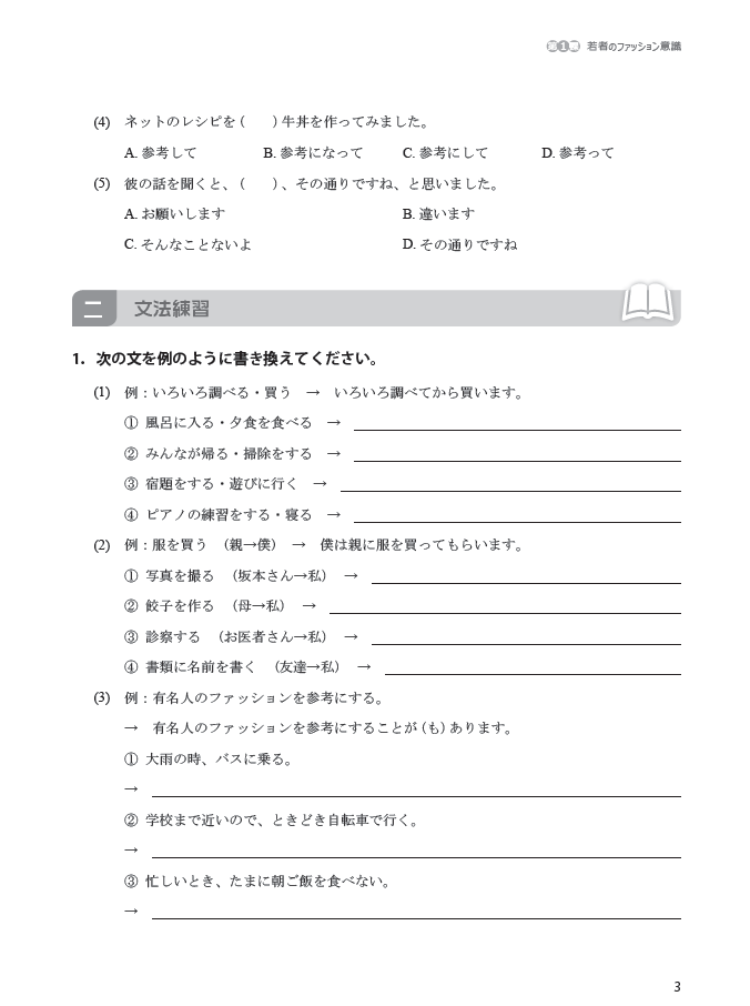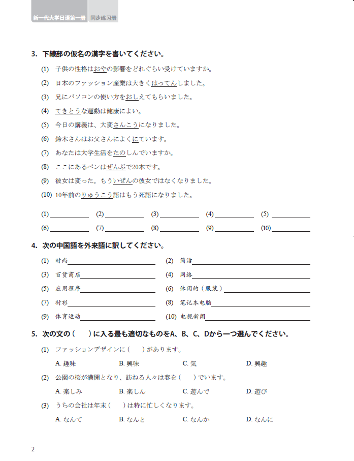 《新一代大学日语第一册》系列教材是由中日两国从事日语教学与研究的专家学者通力合作开发的大学日语教材。该教材依据《大学日语教学指南(2020版)》(以下称《指南》)《大学日语课程教学要求》《大学日语四、六级考试大纲》编写而成,适用于高等教育非零起点的大学日语学习者。《新一代大学日语第一册同步练习册》为《新一代大学日语第一册》的配套练习册。本练习册依据《大学日语教学指南(2021版)》(以下称《指南》)《大学日语课程教学要求》《大学日语四、六级考试大纲》编写而成。由于大学日语课时有限,为了帮助学习者夯实语言基础、巩固学习效果、提升自主学习的意识,《新一代大学日语(第一册)》编写团队结合主教材学习内容编写了练习册。本练习册包含教材(共12课)的单课练习和4个单元测验。单课练习由词汇练习、语法练习、翻译练习、作文练习组成,单元测验由听力、词汇、语法、阅读、造句五大模块组成。单元测验的题型对接大学日语四级考试。