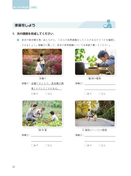 《新一代大学日语第二册》教材是由中日两国从事日语教学与研究的专家学者通力合作开发的大学日语教材。该教材依据《大学日语教学指南(2020版)》(以下称《指南》)《大学日语课程教学要求》《大学日语四、六级考试大纲》编写而成,适用于高等教育非零起点的大学日语学习者。第二册覆盖《指南》中“提高目标”的全部语言知识点,《指南》指出,大学日语课程的性质为高校通识教育,兼具工具性和人文性,在教材编写等环节尤其要重视丰富人文内涵,实现工具性和人文性的有机统一。根据《指南》要求,本教材以提升大学生的认知发展水平和日语综合能力为目标开展了设计与编写。本教材以“持続可能性日本語教育(以可持续发展为中心思想的日语教育)”为编写理念,注重同步发展学习者的语言能力与思维能力,旨在帮助学习者提升日语综合能力的同时,培养个人可持续发展能力。
