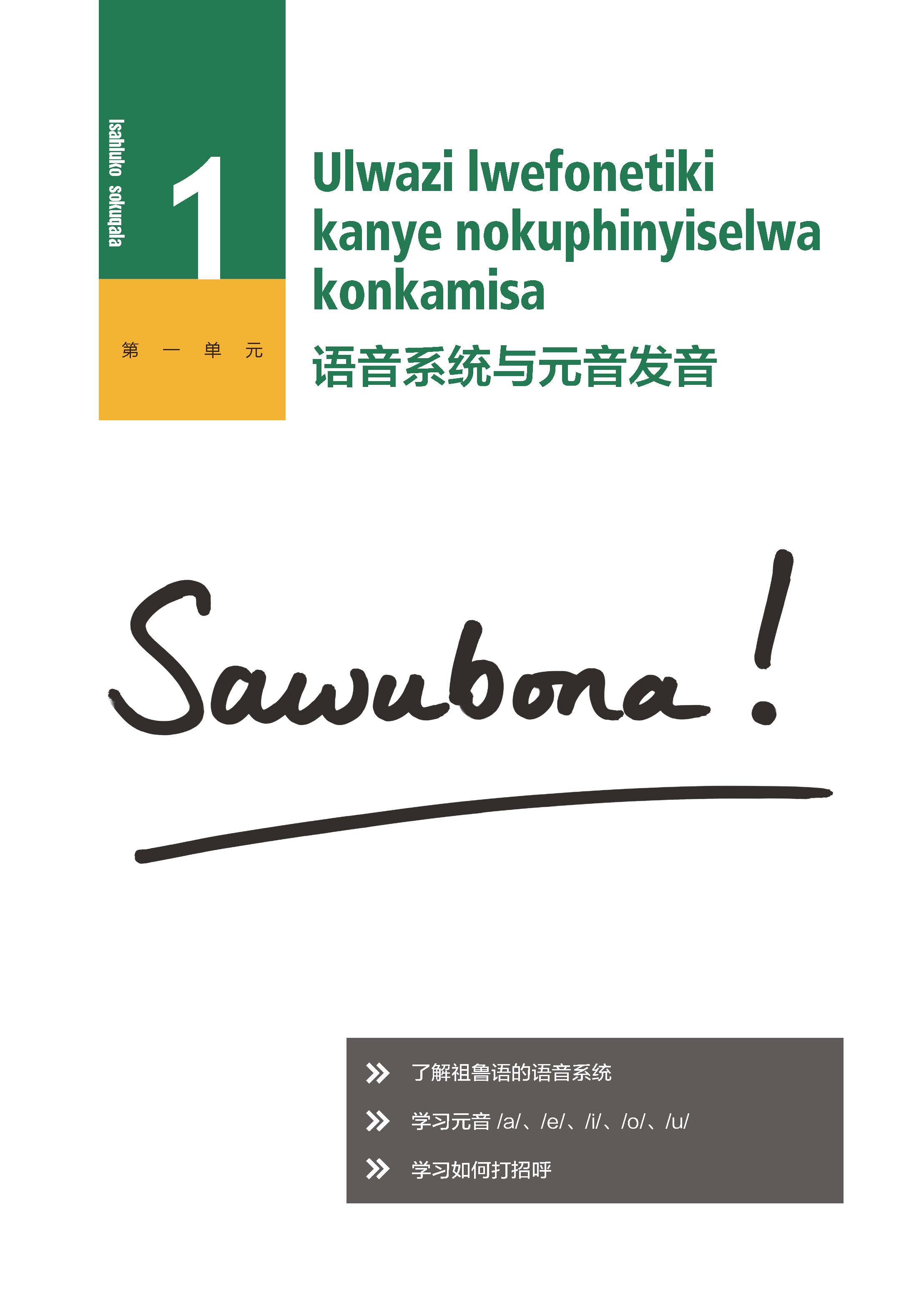 《新经典祖鲁语综合教程1》是"新经典祖鲁语综合教程"的第一册,供祖鲁语专业本科一年级第一学期使用。它也是至今为止国内出版的唯一一本祖鲁语教材。教材共16单元,共含32篇课文,每单元包括课文、语音/语法和课后练习三大板块。