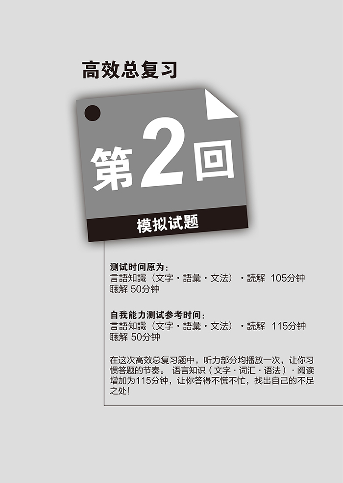 完全依据JLPT日语能力考试官网要求出题,文字、词汇、语法、阅读、听力,面面俱到!