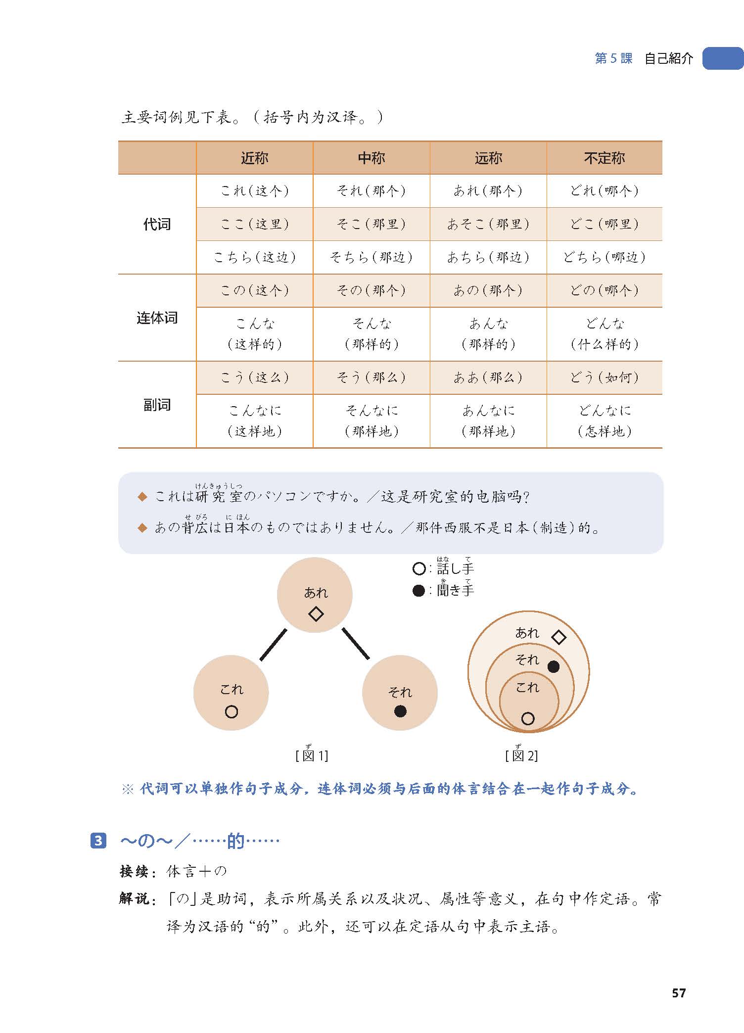 每册教材分为"课文、会话、单词、语法解说、练习和小知识"等几大板块。课文内容贴近新时代生活,并融入"立德树人"的思政教育,选材流行文化、社会问题、科技创新、时代发展等多个话题。"课文"后,设置了与其内容相匹配的"会话",建立真实的交流情景;词汇设置分层模式,区分必备词汇和拓展词汇,同时提高词汇覆盖率和复现率;语法内容聚焦重点难点,对核心语法及主要句型进行精炼,讲解例句丰富、调整难度阶梯;练习设计科学,与所学知识点环环相扣,培养学生听、说、读、写、译等语言技能和日语综合运用能力。