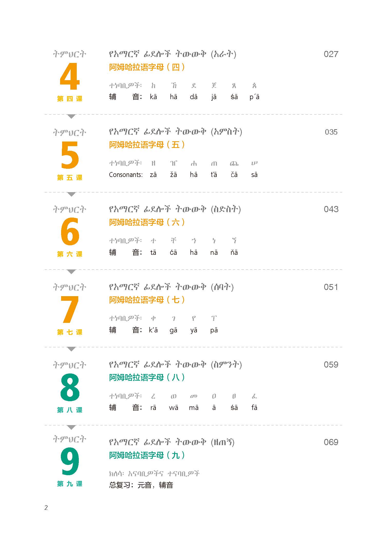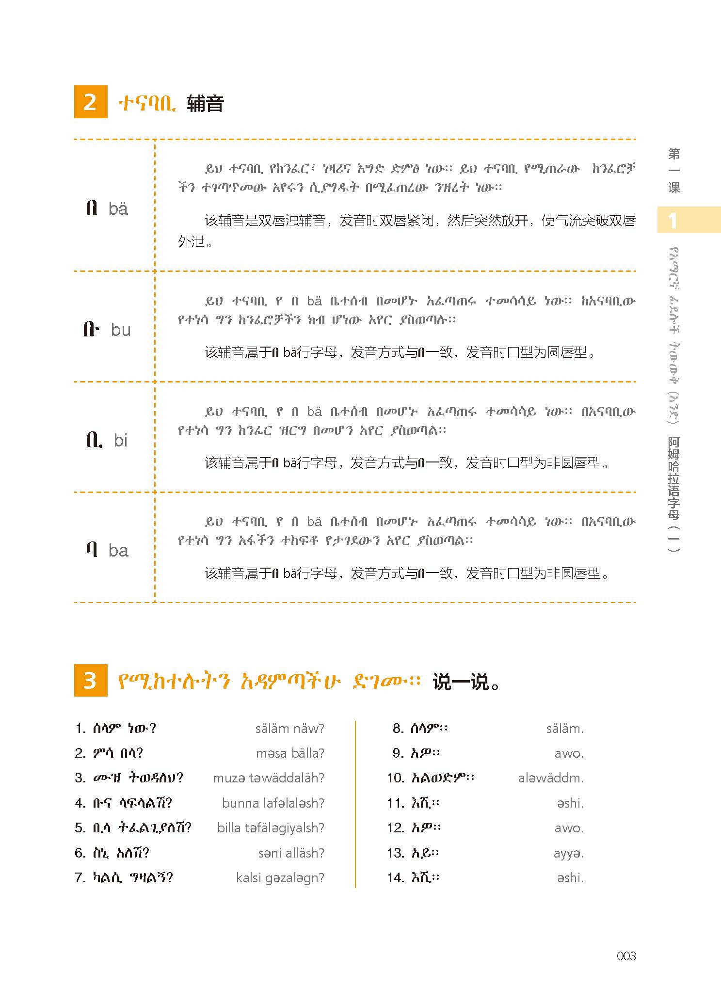 《新经典阿姆哈拉语教程1》包含不同的主题,如:介绍阿姆哈拉语字母,如何用阿姆哈拉语打招呼,词汇,语法等。书中还涉及介绍埃塞俄比亚民俗文化,埃塞俄比亚传统食物和饮料等相关的阅读材料。