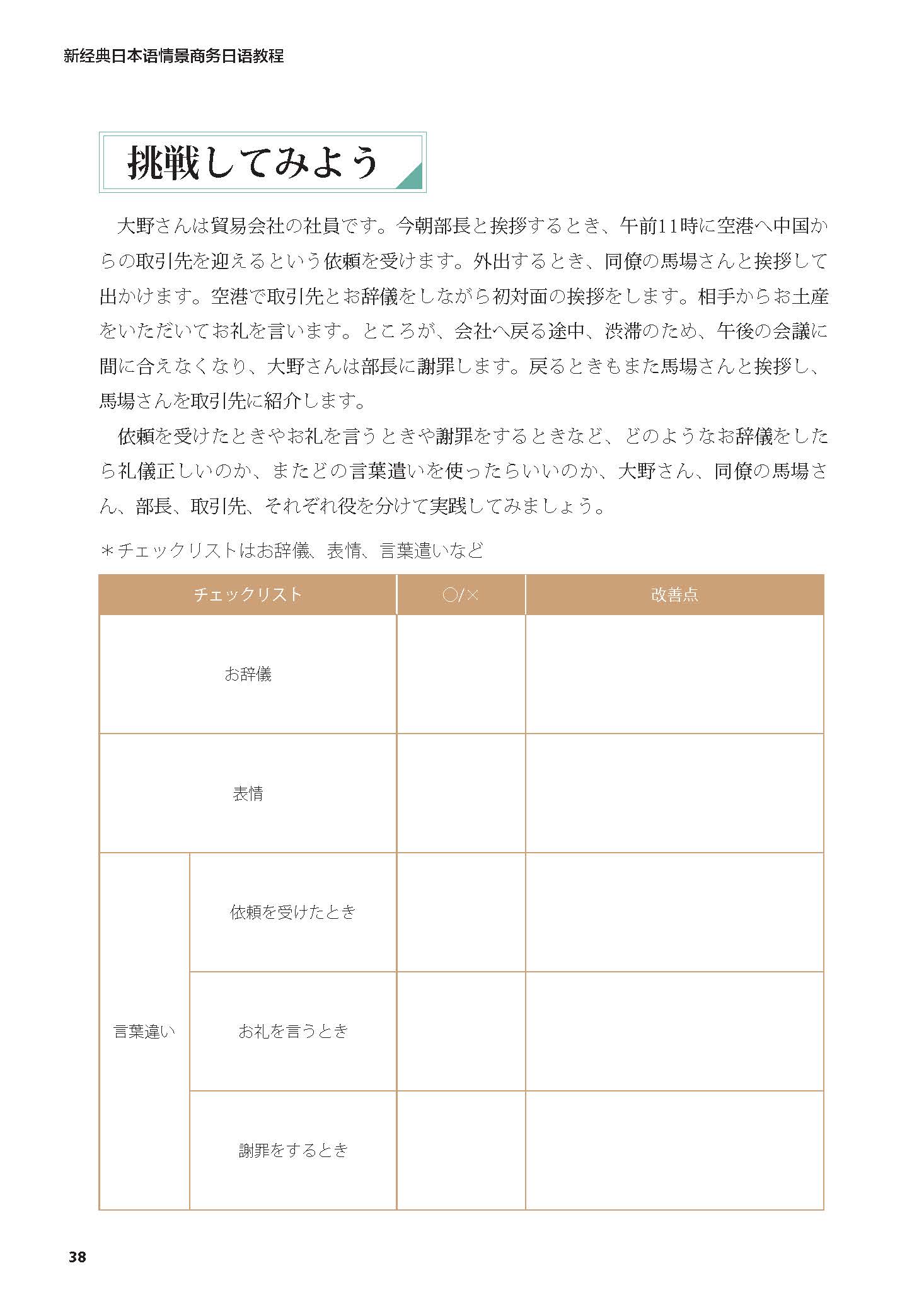 《新经典日本语情景商务日语教程》属于《新经典日本语》系列高年级阶段教材。旨在培养学生在商务场合进行商务活动所需要的各方面能力。本教材由商务用语、就业指导、商务礼仪、商务接待、商务沟通技巧5个部分构成,共17课。从语言、举止、意识等角度全方位地帮助学生熟练掌握工作中常用的商务知识。为了体现“情景”,本教材通过大量插图模拟真实场景,以问答形式导入商务知识,再通过练习题和挑战题巩固知识、训练能力,达到学以致用的目的。