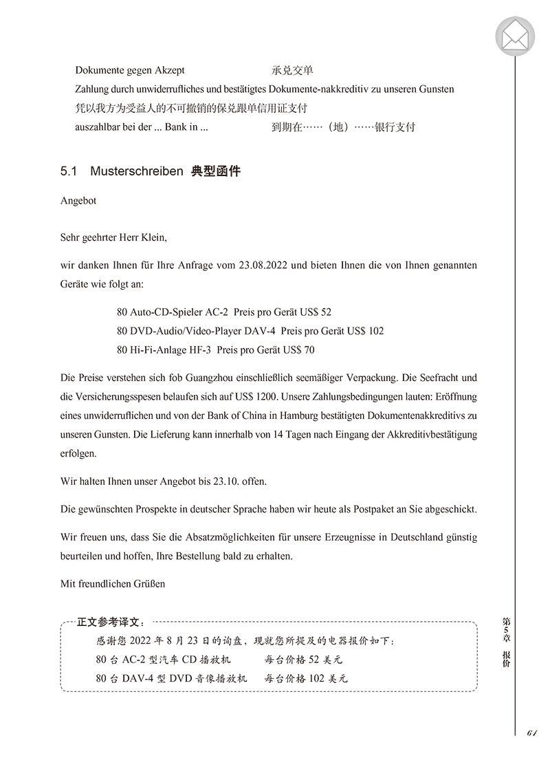 《德语商务信函写作(第二版)》 是专为从事德语外贸行业的人士以及有志于从事国际贸易的德语专业学生编写。内容涵盖商贸德语的方方面面。相比第一版教程,本书作者在《德语商务信函写作(第二版)》新增添了一些新的德语合同文本,更符合当今对德商务交往的需求。本书内容包括了外贸函件的各类格式、邮寄发送以及商务工作的各个业务环节等。结合近年国际贸易出现的新情况,可指导商务函件实际操作,贴合信息化时代要求,符合中德两国商务贸易往来的需求,为从事中德两国商务交往的专业人士,以及德语学习者提供有益指导。