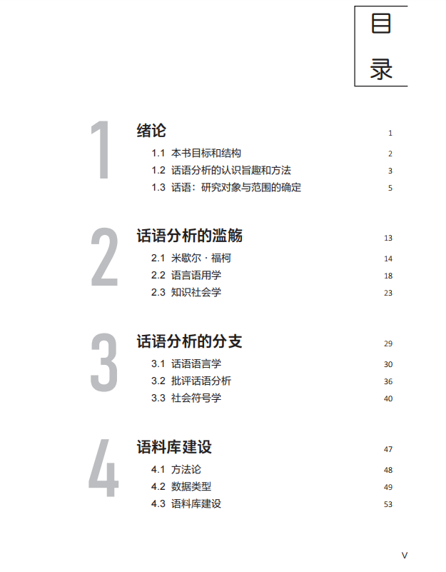 《语言学话语分析教程》是一本更侧重于实际操作的教材。作者拉尔谢对复杂晦涩的话语理论和纷繁芜杂的话语流派进行了精简处理,把重点放在了对话语语言学研究方法的全面介绍。书中所展现的话语分析框架涉及篇章、话语和社会三个层面:(1)篇章层面涵括了篇章分析、对话分析和图像分析等多种分析路径;(2)话语层面指向跨篇章模式,其中包括论证模式、阐释模式、篇章模式、对话模式和视觉定型等;(3)社会层面涉及知识和权力分析,主要介绍如何在批判性视角下探析话语与真理、正常性、意识形态和霸权等社会现象的相互关联。方法部分的介绍遵循的是研究的逻辑:从建立语料库到单个篇章的分析,再到跨篇章的话语模式的识别,最后从话语分析扩展到社会分析。