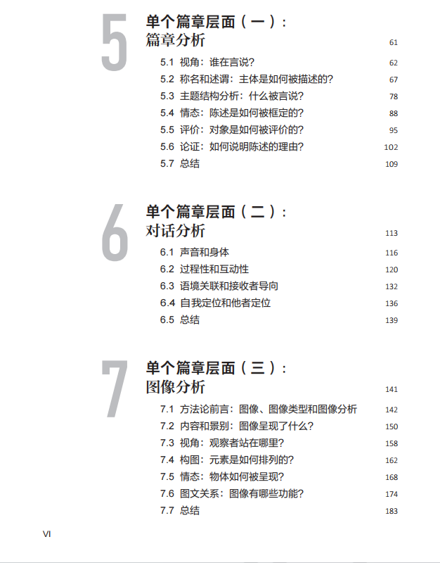 《语言学话语分析教程》是一本更侧重于实际操作的教材。作者拉尔谢对复杂晦涩的话语理论和纷繁芜杂的话语流派进行了精简处理,把重点放在了对话语语言学研究方法的全面介绍。书中所展现的话语分析框架涉及篇章、话语和社会三个层面:(1)篇章层面涵括了篇章分析、对话分析和图像分析等多种分析路径;(2)话语层面指向跨篇章模式,其中包括论证模式、阐释模式、篇章模式、对话模式和视觉定型等;(3)社会层面涉及知识和权力分析,主要介绍如何在批判性视角下探析话语与真理、正常性、意识形态和霸权等社会现象的相互关联。方法部分的介绍遵循的是研究的逻辑:从建立语料库到单个篇章的分析,再到跨篇章的话语模式的识别,最后从话语分析扩展到社会分析。
