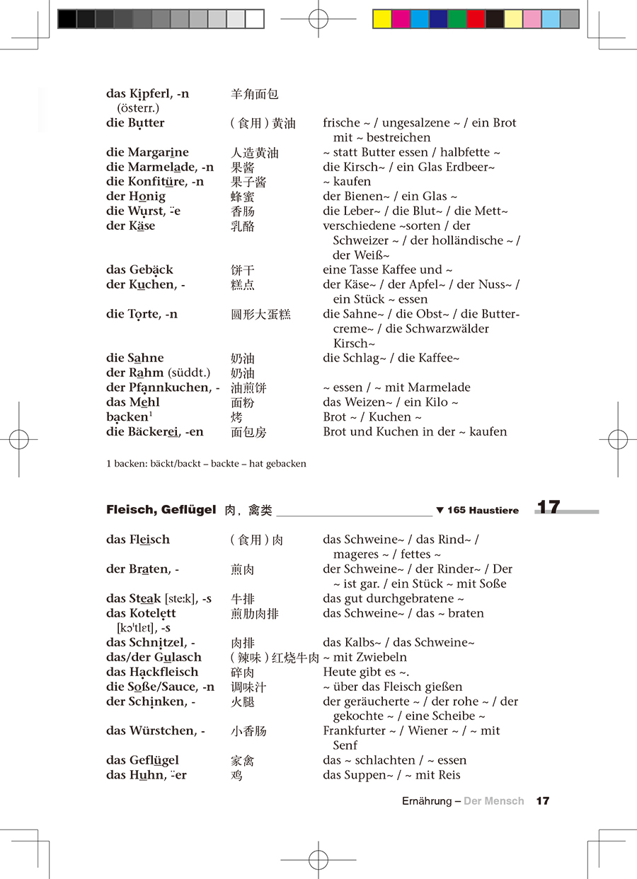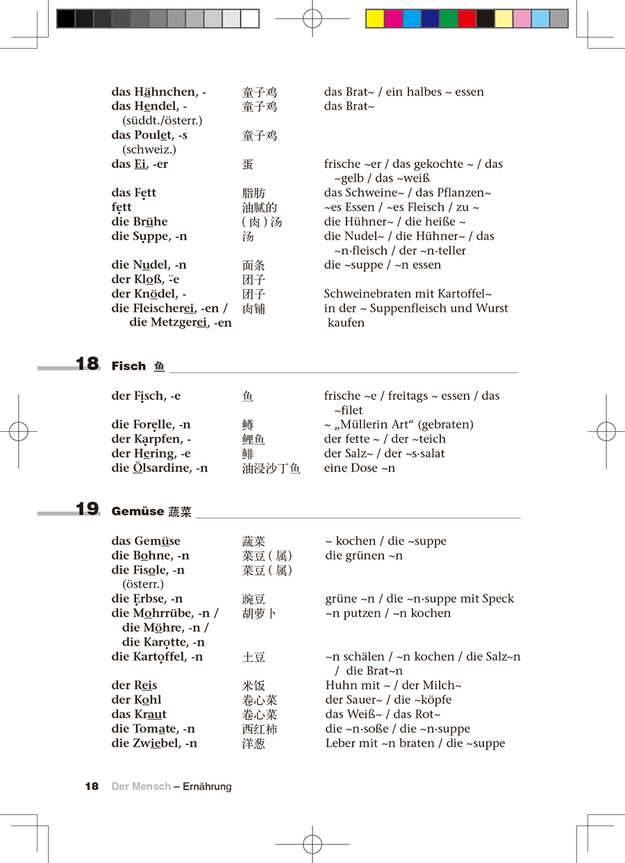 3. 将左栏的德语单词覆盖住,大声朗读第三栏中的例解,其中相应的单词用波浪线代替了,这样可以强化记忆。