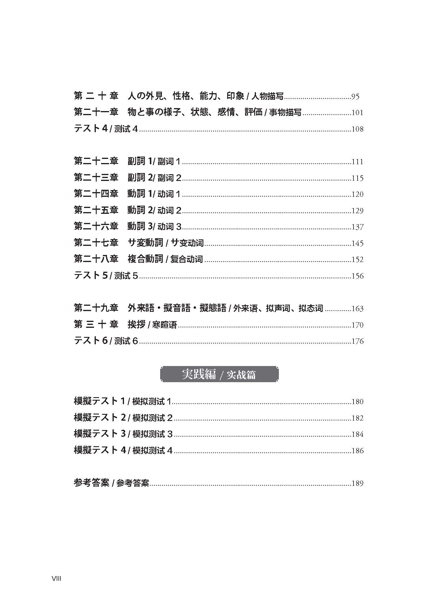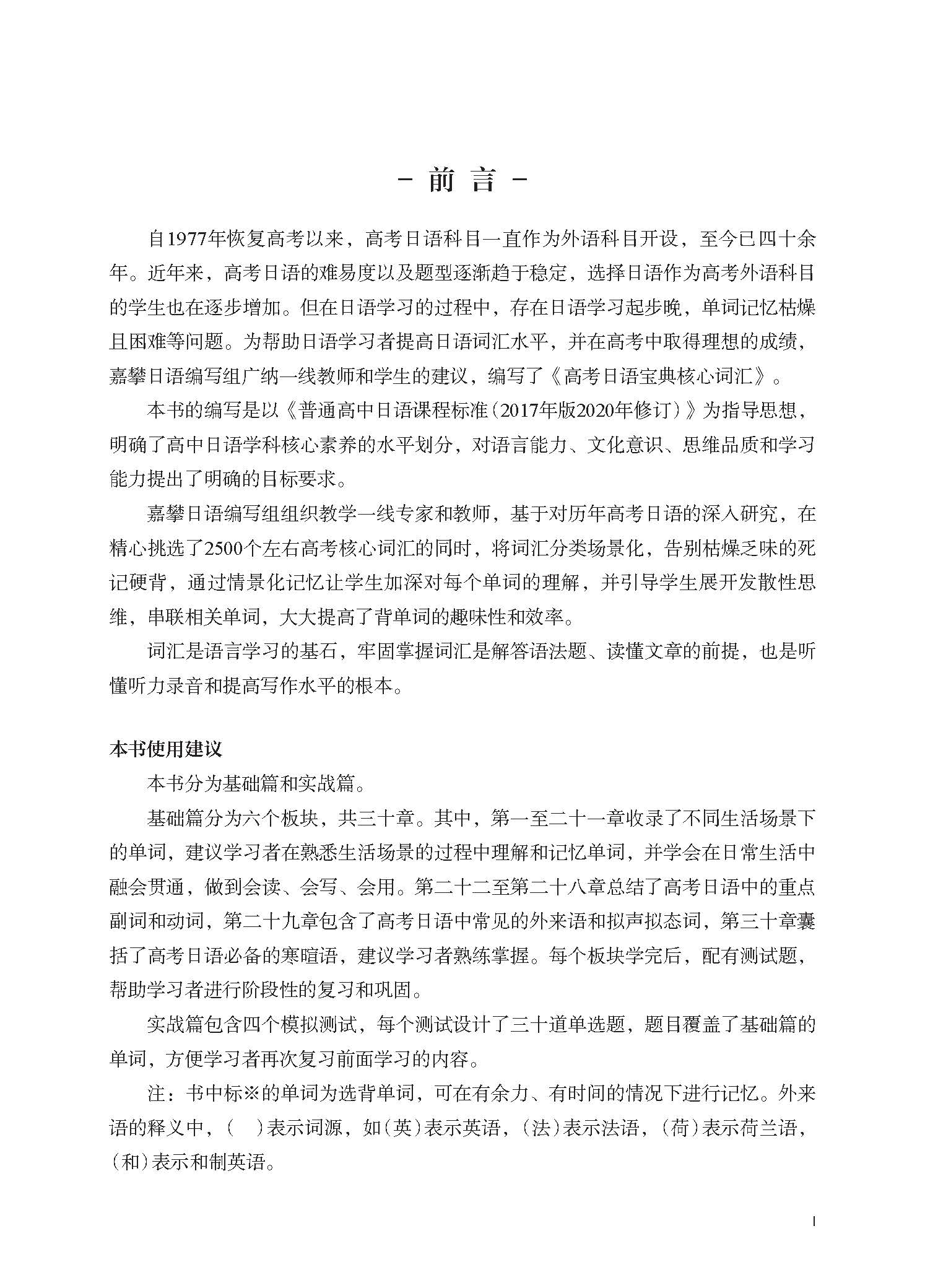 本书分为基础篇和实战篇。基础篇分为六个板块,共三十章。其中,第一至二十一章收录了不同生活场景下的单词,建议学习者在熟悉生活场景的过程中理解和记忆单词,并学会在日常生活中融会贯通,做到会读、会写、会用。第二十二至第二十八章总结了高考日语中的重点副词和动词,第二十九章包含了高考日语中常见的外来语和拟声拟态词,第三十章囊括了高考日语必备的寒暄语,建议学习者熟练掌握。每个版块学完后,配有测试题,帮助学习者进行阶段性的复习和巩固。实战篇包含四个模拟测试,每个测试设计了三十道单选题,题目覆盖了基础篇的单词,方便学习者再次复习前面学习的内容。