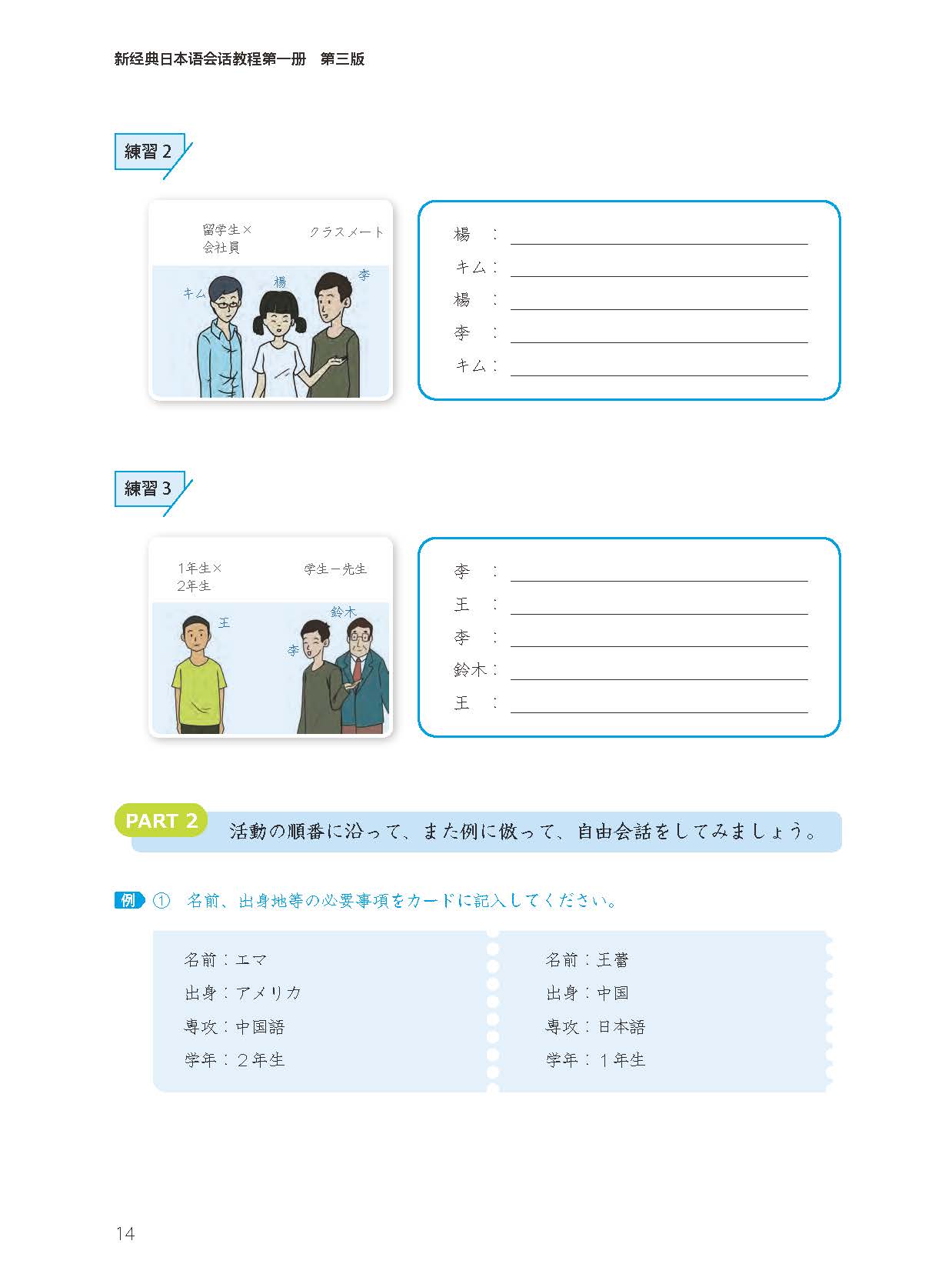 《新经典日本语会话教程第一册(第三版)》共14课,以语法为纲,培养学习者的基础会话能力。每课由「ウォーミングアップ」「基礎会話」「応用練習」「挑戦してみましょう」这4部分组成。每个「基礎会話」有4—6个练习,每个「応用練習」有3个练习。「挑戦してみましょう」分为两个部分。