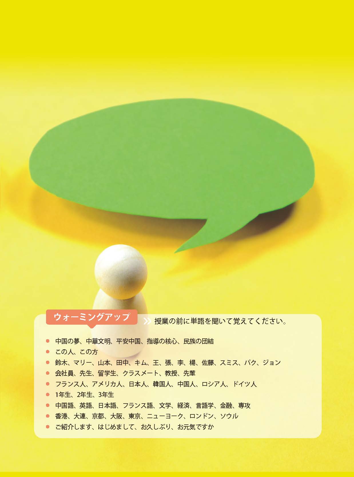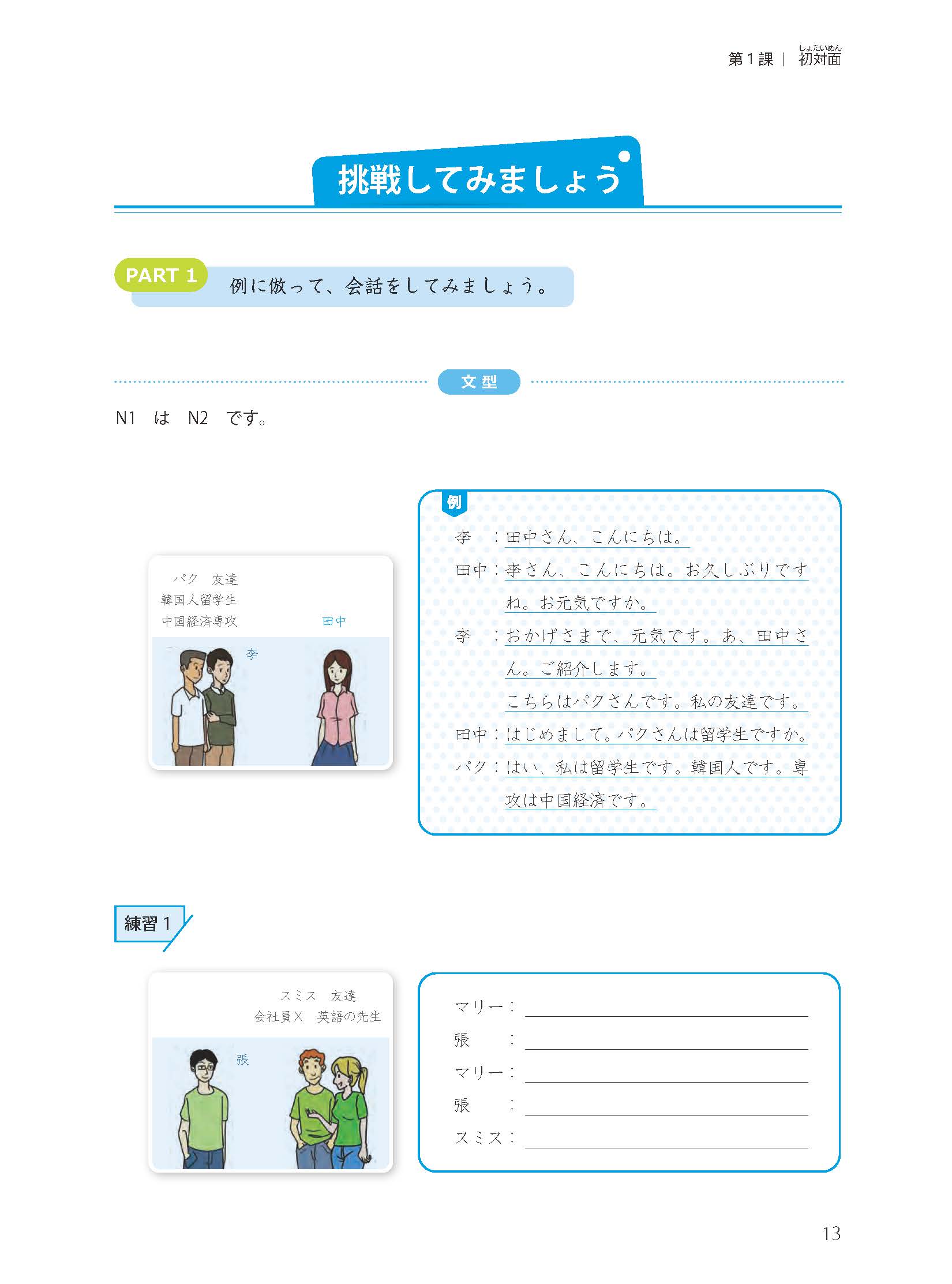 《新经典日本语会话教程第一册(第三版)》共14课,以语法为纲,培养学习者的基础会话能力。每课由「ウォーミングアップ」「基礎会話」「応用練習」「挑戦してみましょう」这4部分组成。每个「基礎会話」有4—6个练习,每个「応用練習」有3个练习。「挑戦してみましょう」分为两个部分。