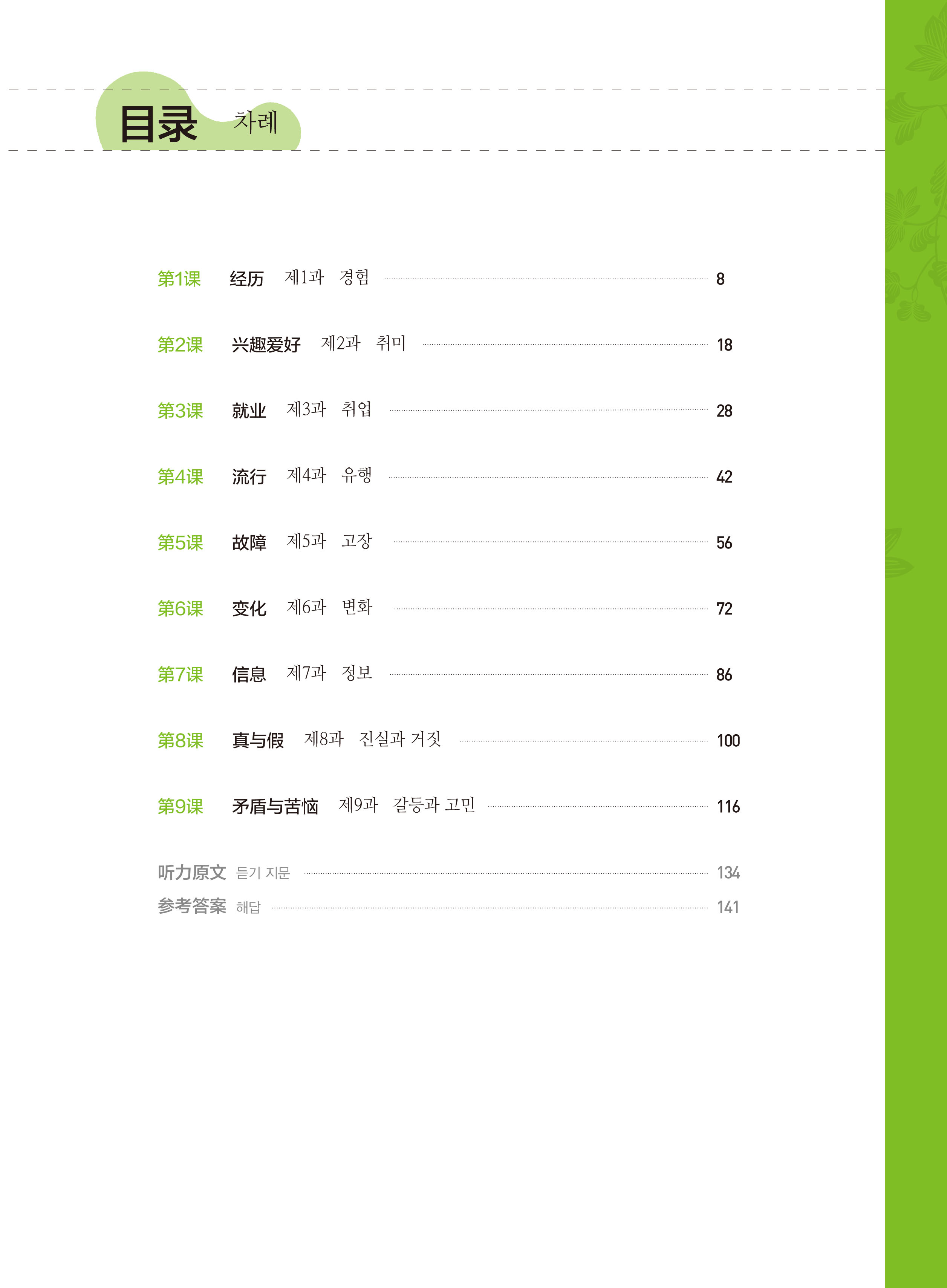 教材内容从基础的语音开始讲解,循序渐进,涵盖了日常学习、生活的各个方面,实用性强;词汇和语法讲解详细,易于掌握;教材结构新颖,设置了诸如小贴士、判断对错等生动的模块;大量精美的图片、丰富的课后练习为韩国语的学习添加了乐趣。全书韩汉对照,易学实用。每册均配有一张韩国原版MP3光盘,语言地道,语音纯正。为了便于初学者学习,我们还为主教材添加了点读功能。另外,为了便于学习者自测,我们将本书的听力部分整理成线上测试,上传至外研社高等学校韩语专业教学管理平台,下载后即可进行线上测试体验。同步练习册每课的主题与主教材一致,练习题丰富全面。为了配合主教材听、说、读、写全面发展的学习目标,练习册中也设置了相应的练习,学习者可以通过这些练习加深对主教材内容的理解,全面提高韩国语水平。