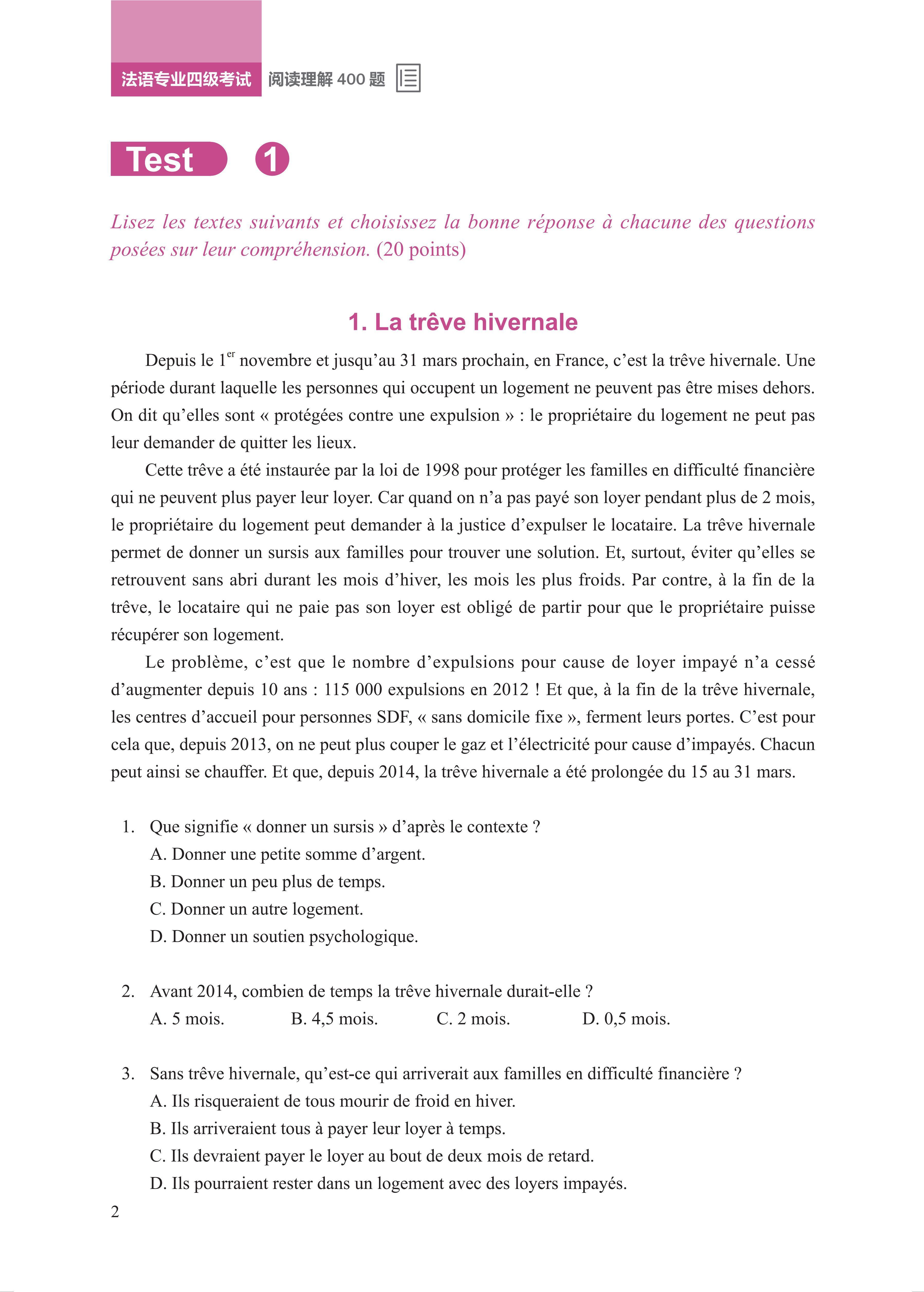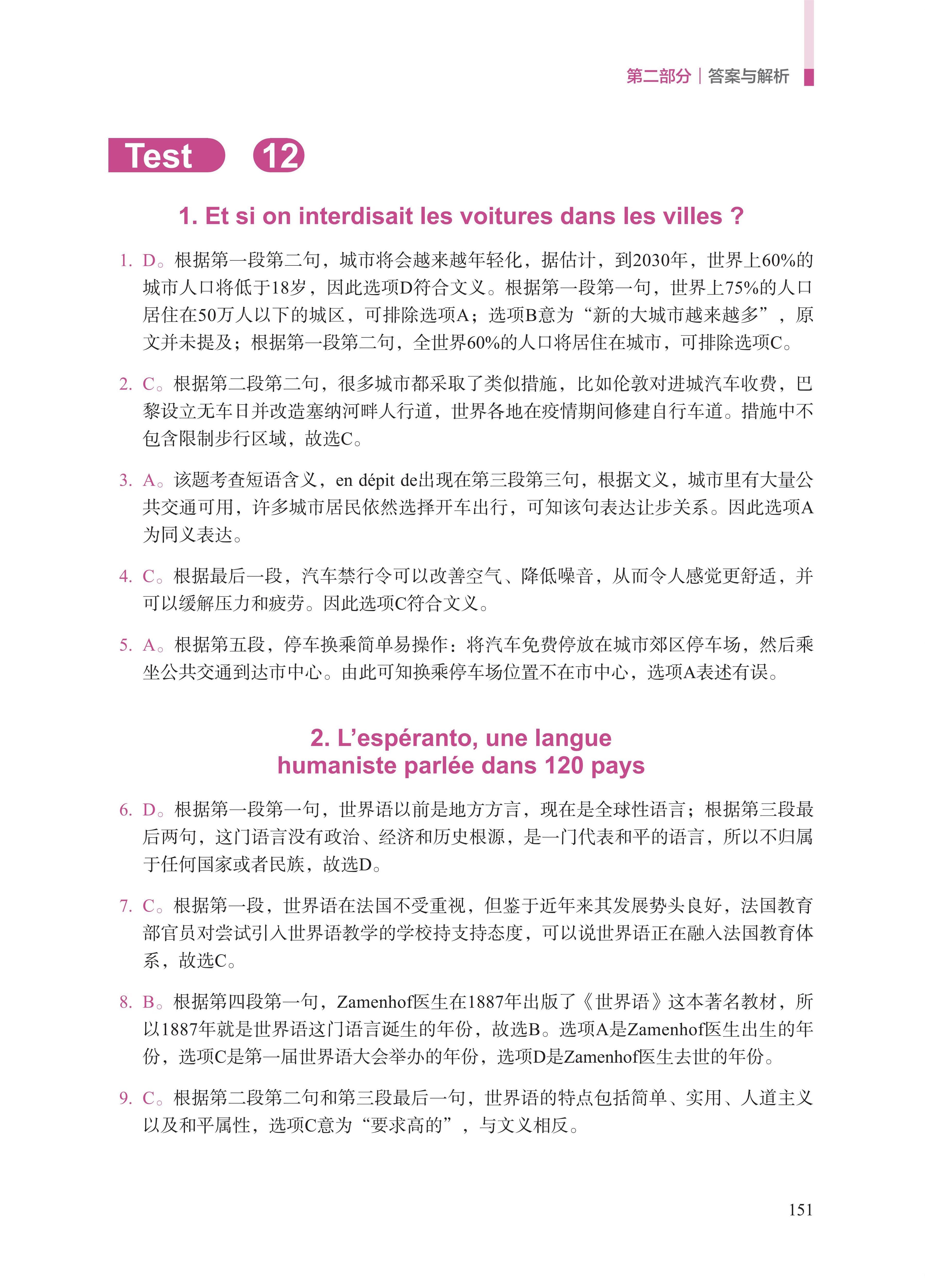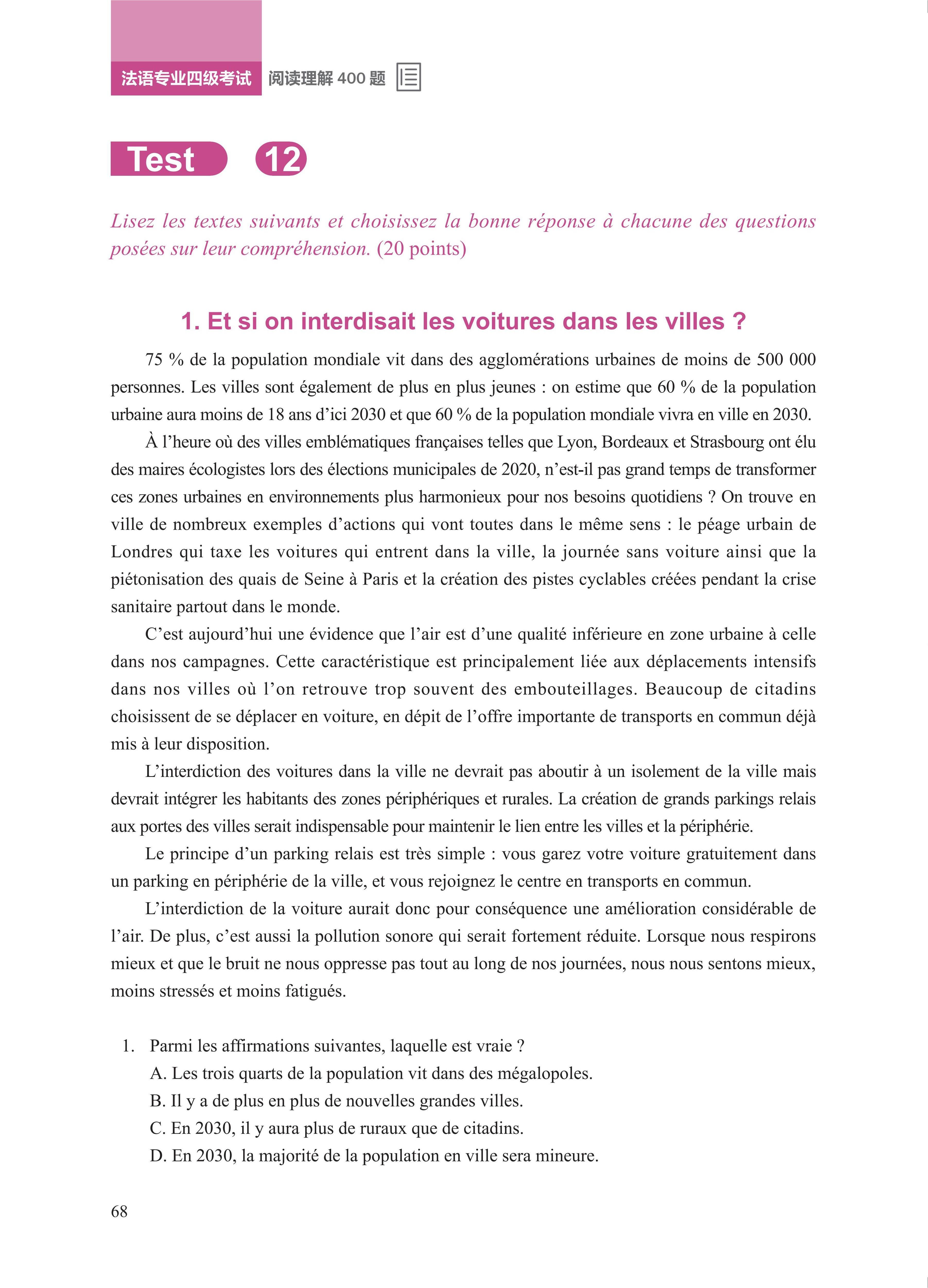 《法语专业四级考试阅读理解400题》是专为法语专业本科二年级学生备考“专四”编写的阅读理解专项训练手册。本书由教学备考经验丰富的一线中法教师联合编写,帮助考生实现阅读理解专项突破。全书分为阅读理解模拟题、答案与解析两部分,第一部分包括阅读理解全真模拟题80篇,分为20个单元,每单元含4个语篇,难度循序渐进,第二部分是答案与解析,围绕“专四”主要考点,帮助考生梳理所学知识,从容应考。试题题型、测试角度、文本长度均与法语专业四级考试保持一致,符合考纲要求;涵盖时态语法、文本理解、词义辨析等方面的考查,帮助学生熟悉掌握考点;答案解析清晰,突出考查重难点,帮助学生梳理相关知识与答题思路。
