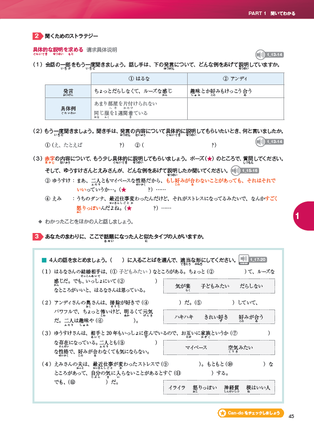 全书分为9大话题,分别为“怎样的人”“登富士山”“健康生活”“看舞台剧”“身边见闻”“想要这个”“喜欢的电影”“我城市里的交通机构”“那个年代的忍着、武士”,其中每个话题包含2课,均含有热身、听、说、读、写、拓展等学习内容,教程编排以日常常用生活场景为依托,搭配精美实景插图及形式多样的丰富练习。除此之外,本书还重视学习者对学习的自我管理,导入了自我评价环节。