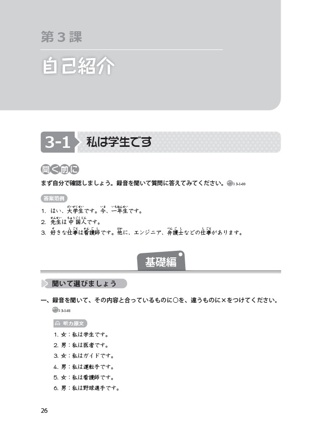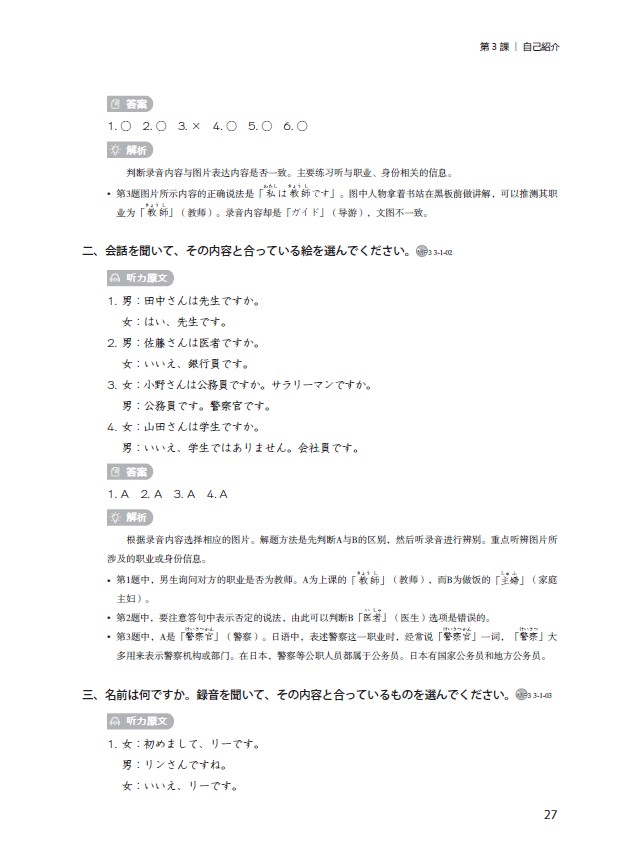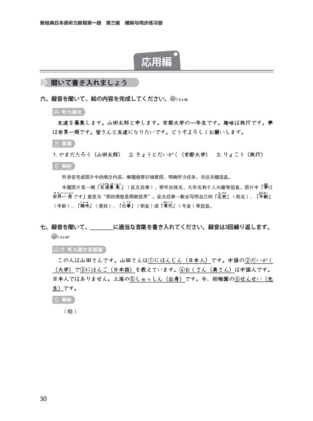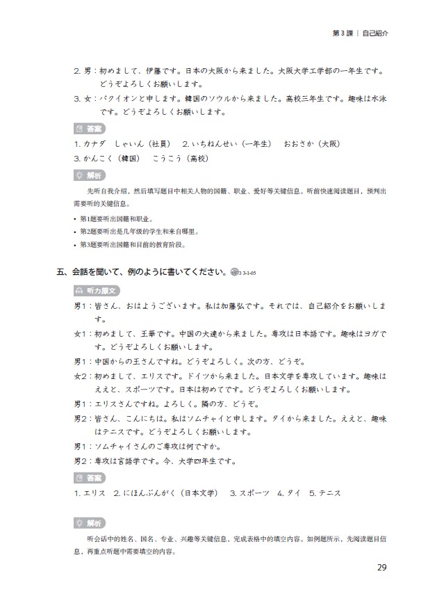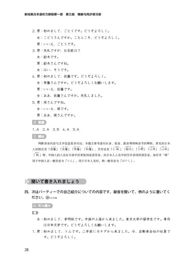 《新经典日本语听力教程第一册(第三版)精解与同步练习册》依据《普通高等学校本科专业类教学质量国家标准(外国语言文学类)》《普通高等学校本科日语专业教学指南》的培养目标、培养规格(素质要求、知识要求、能力要求)以及课程体系的要求编写而成。同时,在日语能力培养方面参照《JF日语教育标准》(日本国际交流基金会),采用进阶式日语能力设计模式。本书由中日两国长期从事日语教育的一线教师共同努力编写而成。