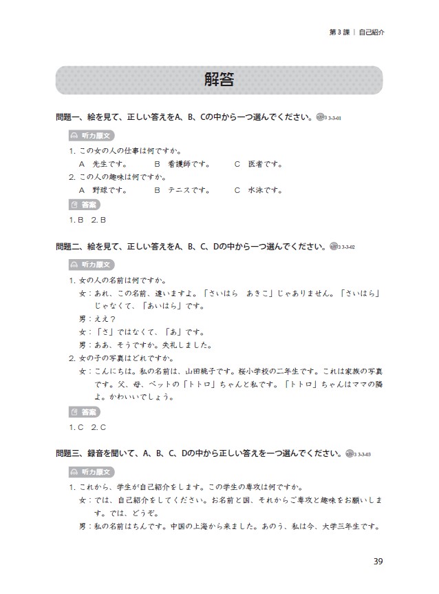 本书是《新经典日本语听力教程第一册(第三版)》的配套教辅,结构与主教材基本一致,内容包括与主教材各部分音频对应的听力原文、解题技巧、答案,此外还配备了与每课内容相关的综合练习题,为学生预习和复习提供了有利的支持和保障。