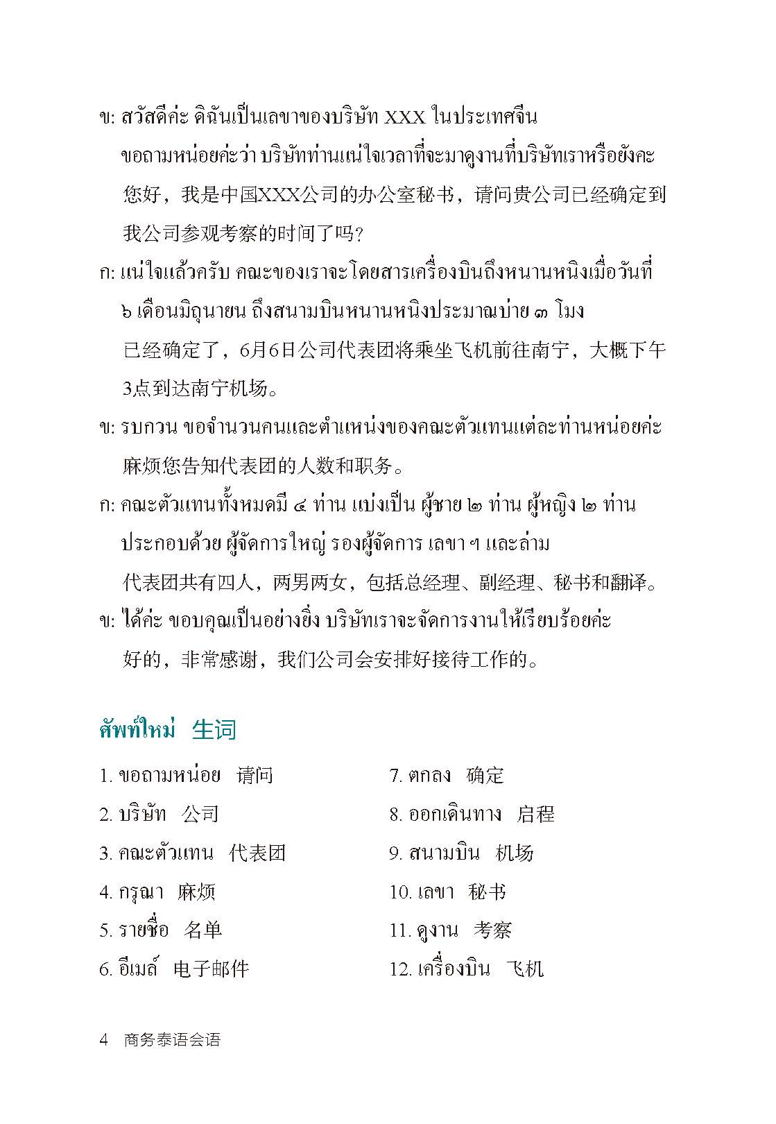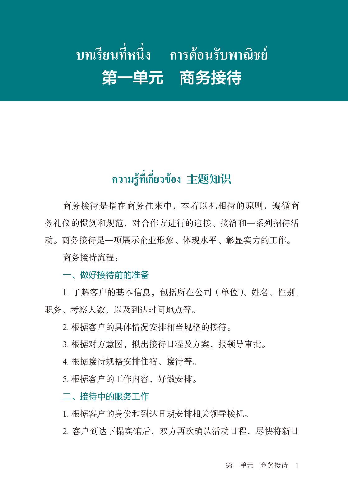 《商务泰语会话》共有六个单元,每个单元5课,以商务活动为导线展开教学。第一单元主题是商务接待,包括确认接待信息,住宿安排,商务宴请,商务会面,商务旅游5个话题;第二单元主题会展,包括中国-东盟博览会,会展接待,邀展,预定展位,取消展位5个话题;第三单元主题是国际贸易,包括商务洽谈,询价,报,订货,签合同5个话题;第四单元主题是跨境电商,包括跨境电商知识认知,客服售前咨询,客服售中沟通,客服售后服务,跨境电商物流5个话题;第五单元主题是导购,包括接待顾客,产品导购实例-茶叶,产品导购实例-丝绸,产品导购实例-珍珠,产品导购实例-绣球5个话题等。