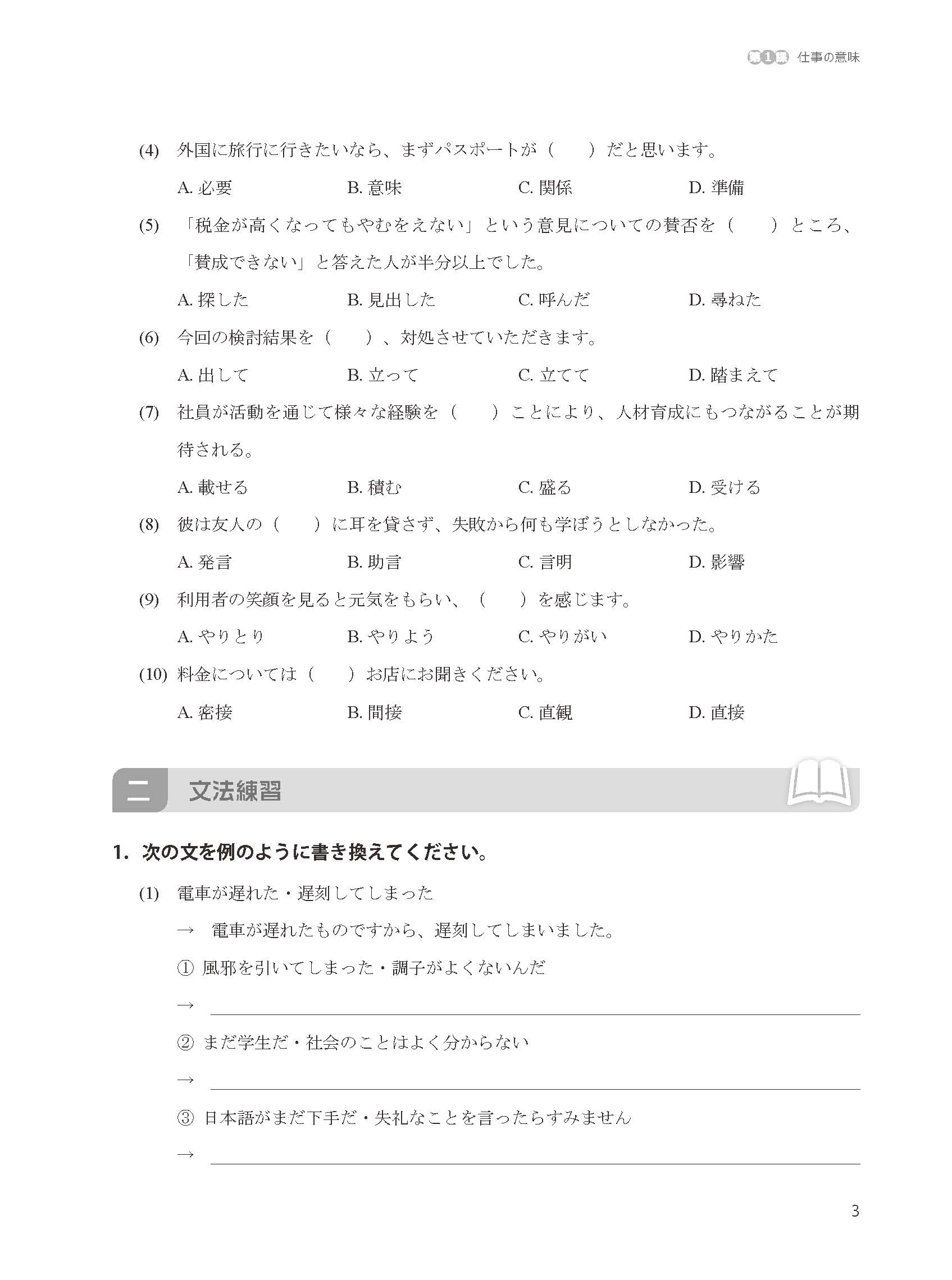 《新一代大学日语第三册同步练习册》为《新一代大学日语第三册》的配套练习册,依据《大学日语教学指南(2021版)》《大学日语课程教学要求》《大学日语四、六级考试大纲(2011年版)》编写而成。由于大学日语课时有限,为了帮助学习者夯实语言基础、增强自主学习意识,《新一代大学日语第三册》编写团队结合主教材学习内容编写了本练习册。《新一代大学日语第三册同步练习册》包含12课单课练习和4个单元测试。单课练习由词汇练习、语法练习、翻译练习、作文练习组成,单元测验由听力、词汇、语法、阅读、造句五大模块组成。单元测验的题型对接大学日语四、六级考试。