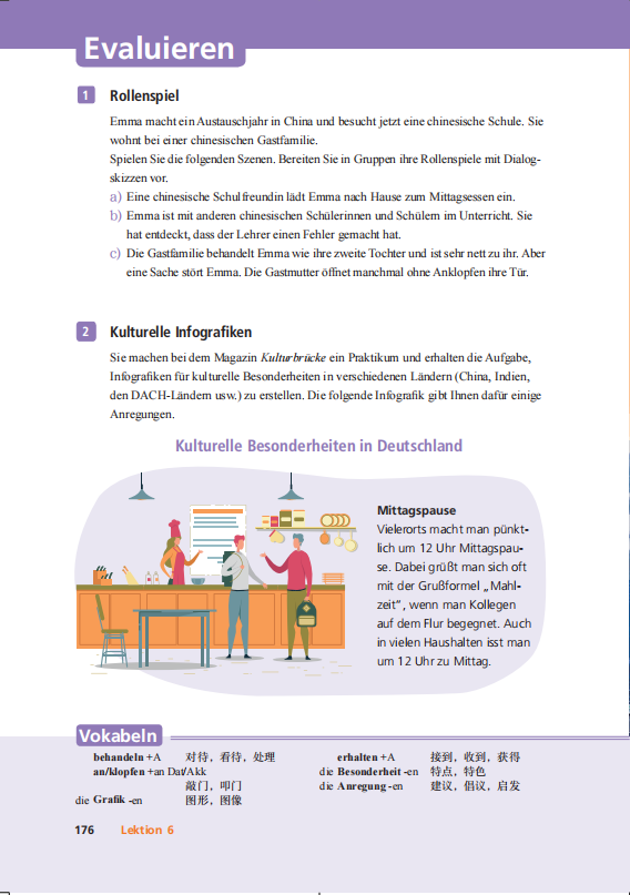 《新经典德语》系列教材在编排时立足中国标准,特别是《普通高等学校本科专业类教学质量国家标准(外国语言文学类)》和《普通高等学校本科德语专业教学指南》中的总体人才培养目标,以及《高等学校德语专业德语教学大纲》中的具体课程和阶段能力目标,同时参考《欧洲语言共同参考框架:学习、教学、评估》中的语言能力量表和德国歌德学院有关德语语法、词汇的具体分级建议,科学布局内容,统筹国内国外标准;