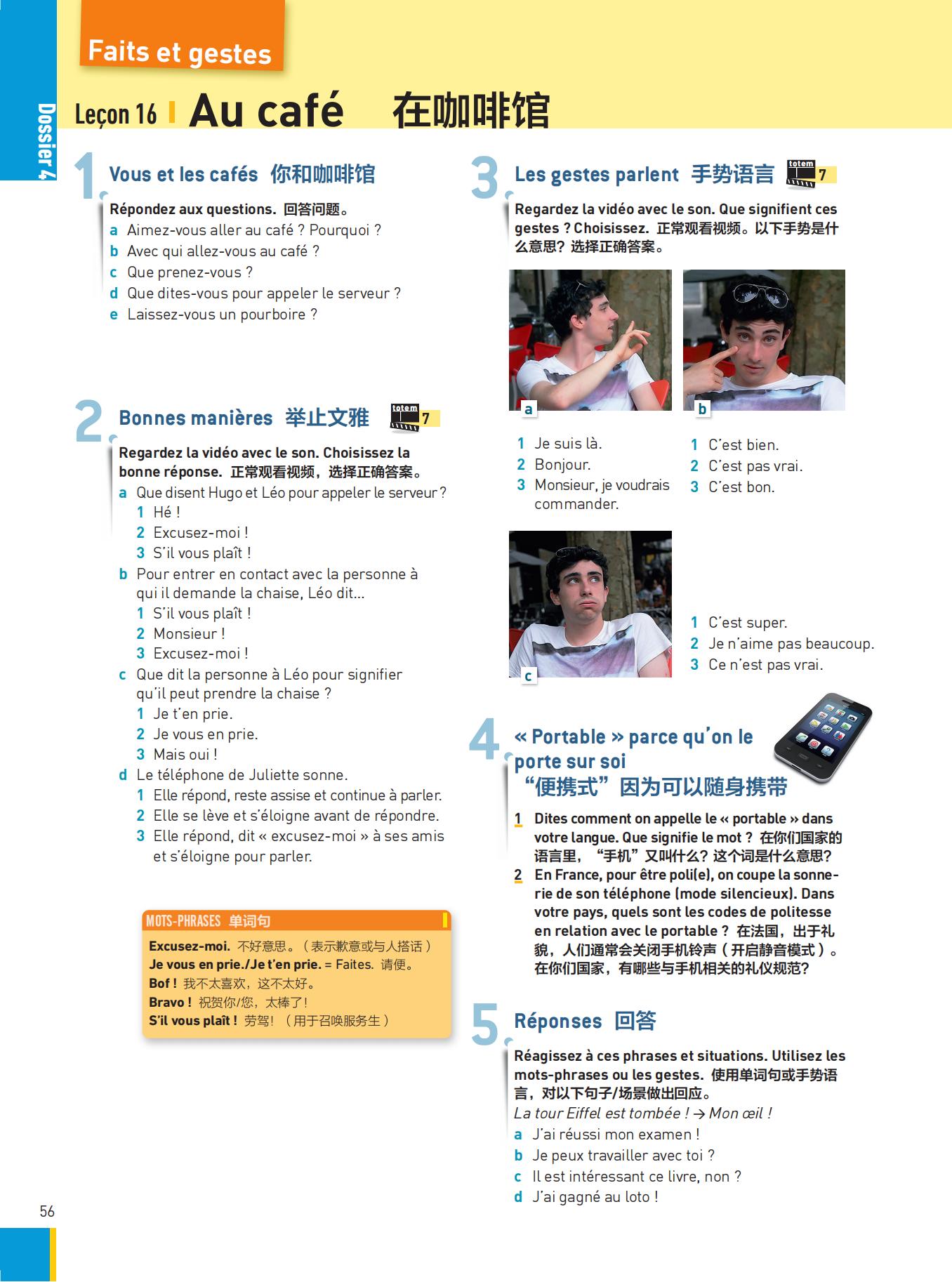“totem大家的法语”采纳融合编写理念:注重交际功能同时,通过任务教学丰富语用实践;主题理解、语言学习和语用实践均以视频、图片文字和音频三种信息载体为起点,语法、语音、词汇句型紧密结合当课主题;除了语言层面的知识挖掘、技能实践,首创性地增加了 Faits et gestes 板块,注重挖掘语言之外、身势语言背后的文化内涵。