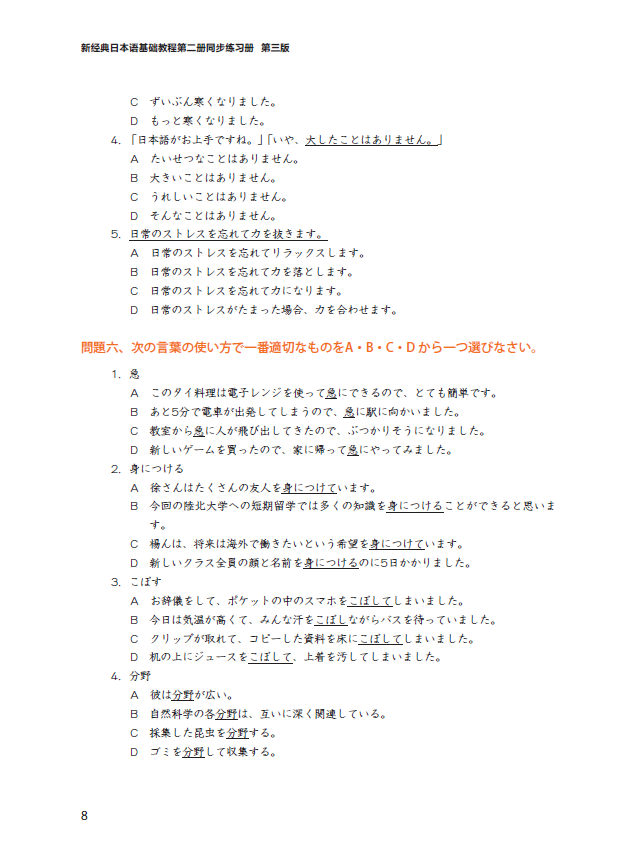 《新经典日本语基础教程第二册同步练习册(第三版)》是《新经典日本语基础教程第二册(第三版)》的配套练习册。书中所有的练习内容均围绕主教材中出现并要求掌握的知识点进行设计与编写,目的是补充、巩固和强化所学知识。