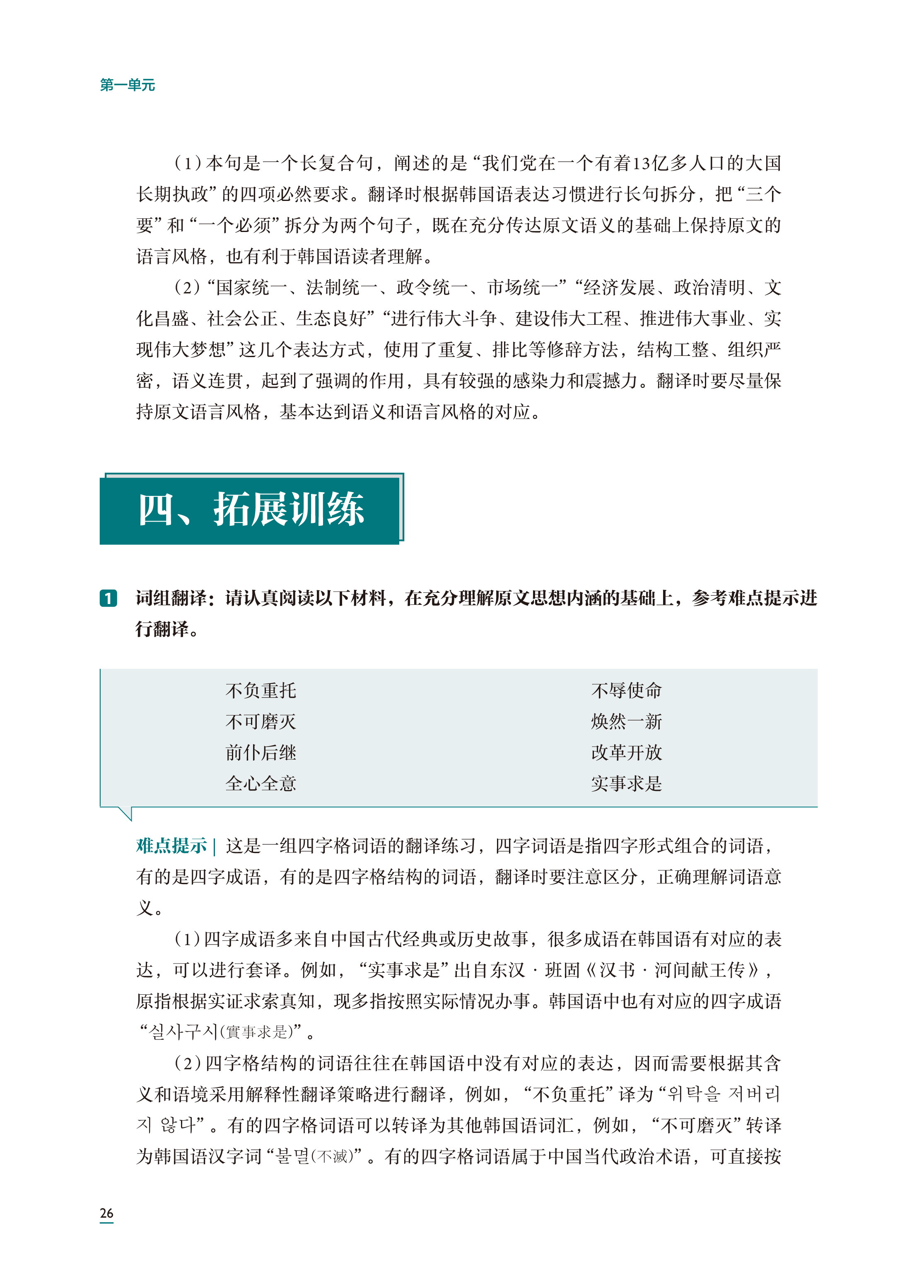 《汉韩翻译教程》为全国高等学校外国语言文学类专业“理解当代中国”系列教材之一,本教程以习近平新时代中国特色社会主义思想为纲,在系统学习与充分理解其思想内容的基础上,聚焦中国时政文献的翻译策略与实践。书稿分为绪论和10个主题单元。绪论介绍中国时政文献的语言特征、中国时政文献的翻译原则和中国时政文献的翻译方法。第一至第十单元为主题单元,每个主题单元探讨习近平新时代中国特色社会主义思想的一个重要方面,依次是:1)中国特色社会主义最本质的特征和中国特色社会主义制度的最大优势;2)坚持和发展中国特色社会主义总任务;3)坚持以人民为中心的发展思想;4)中国特色社会主义事业总体布局和战略布局;5)全面深化改革总目标;6)全面推进依法治国总目标;7)必须坚持和完善社会主义基本经济制度;8)党在新时代的强军目标;9)中国特色大国外交;10)全面从严治党的战略方针。