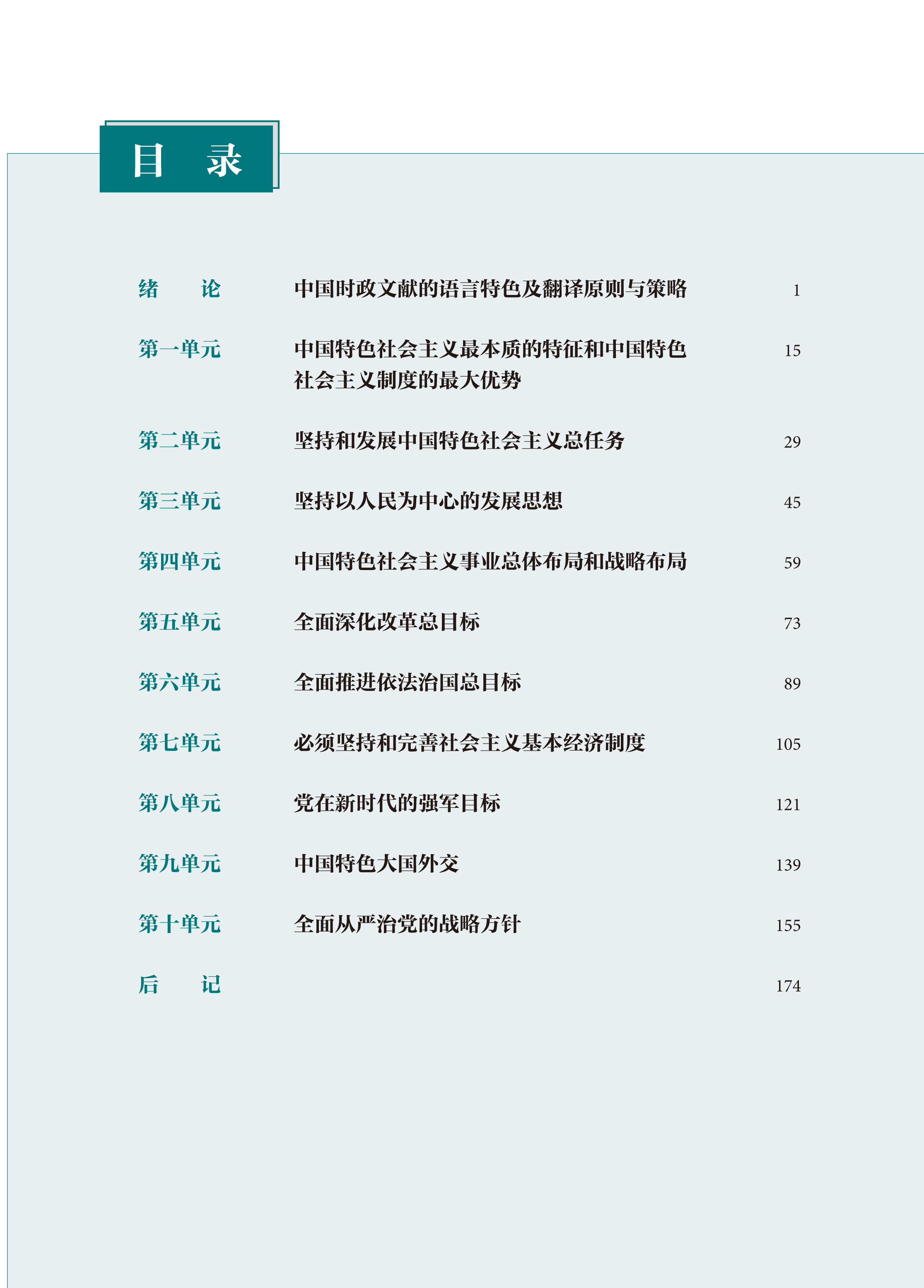 《汉韩翻译教程》为全国高等学校外国语言文学类专业“理解当代中国”系列教材之一,本教程以习近平新时代中国特色社会主义思想为纲,在系统学习与充分理解其思想内容的基础上,聚焦中国时政文献的翻译策略与实践。书稿分为绪论和10个主题单元。绪论介绍中国时政文献的语言特征、中国时政文献的翻译原则和中国时政文献的翻译方法。第一至第十单元为主题单元,每个主题单元探讨习近平新时代中国特色社会主义思想的一个重要方面,依次是:1)中国特色社会主义最本质的特征和中国特色社会主义制度的最大优势;2)坚持和发展中国特色社会主义总任务;3)坚持以人民为中心的发展思想;4)中国特色社会主义事业总体布局和战略布局;5)全面深化改革总目标;6)全面推进依法治国总目标;7)必须坚持和完善社会主义基本经济制度;8)党在新时代的强军目标;9)中国特色大国外交;10)全面从严治党的战略方针。