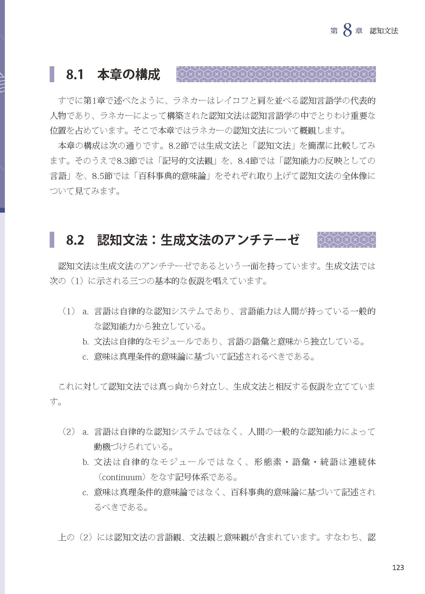 《日语认知语言学入门教程》由「認知言語学とは」「認知言語学の言語観」「認知言語学の意味観」「経験基盤主義」「基本的認知能力」「メタファー」「メトニミー」「認知文法」八个章节构成,帮助学习者对日语认知语言学形成整体了解。