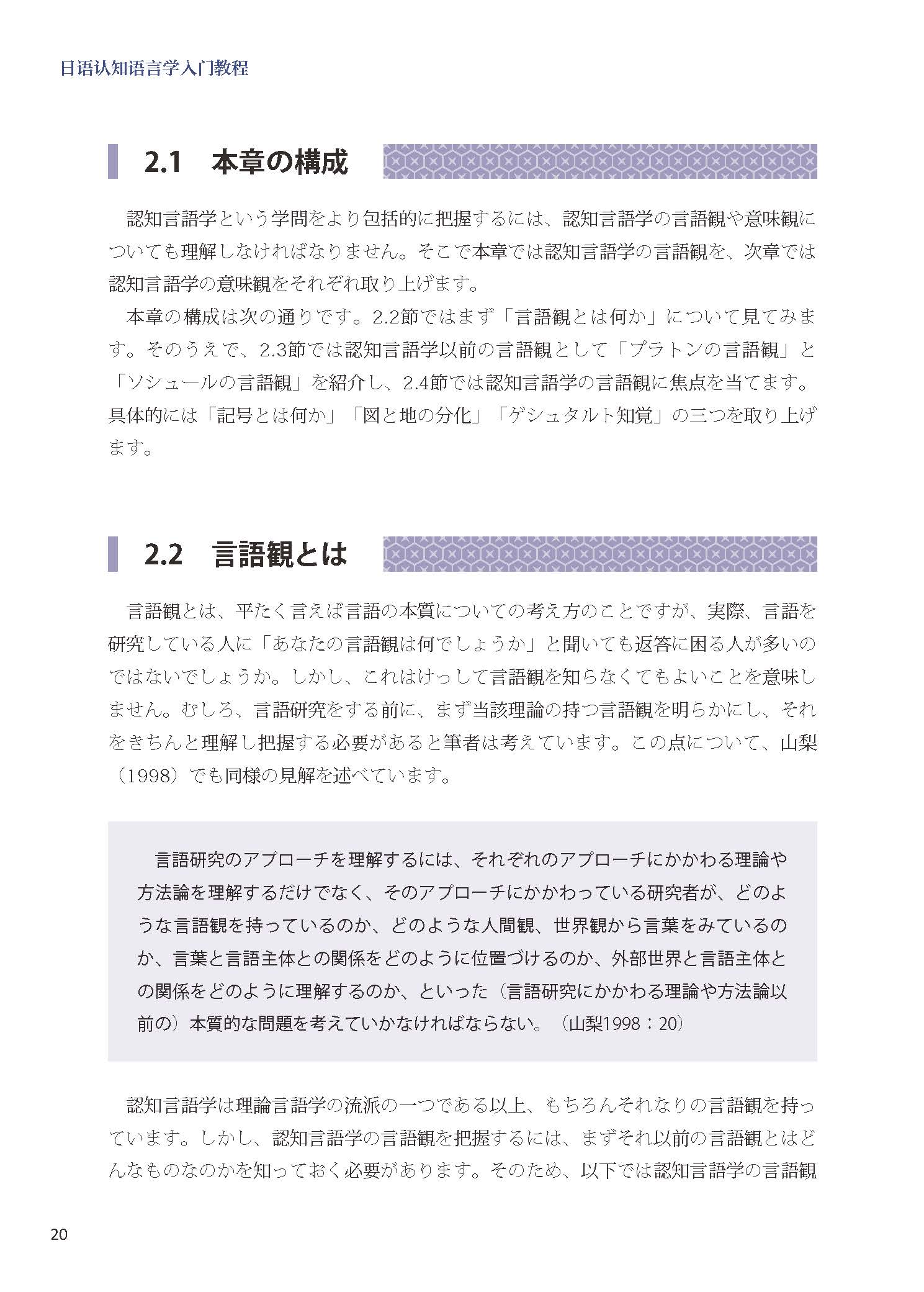 《日语认知语言学入门教程》由「認知言語学とは」「認知言語学の言語観」「認知言語学の意味観」「経験基盤主義」「基本的認知能力」「メタファー」「メトニミー」「認知文法」八个章节构成,帮助学习者对日语认知语言学形成整体了解。