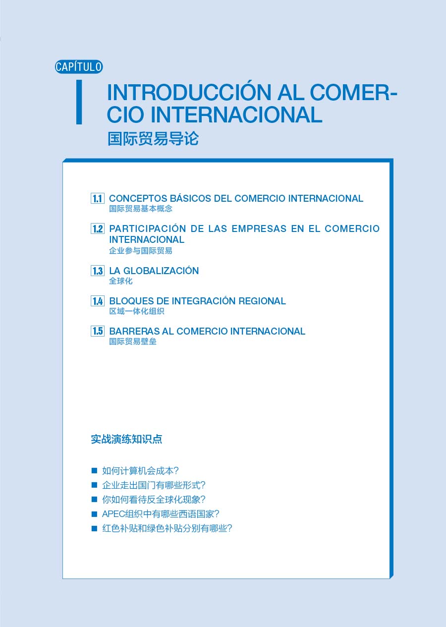 一、中西双语兼顾。本书的西班牙语部分具有独特的实用性,与行业实际紧密挂钩,采用清单化格式叙述,方便学生理解外贸工作的实际流程;中文部分则更加精到,集中阐述,画龙点睛,帮助读者理解实务内容。