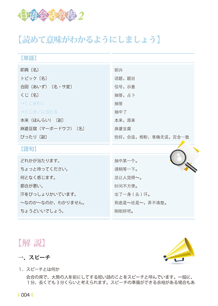 《日语会话教程2》适用于大学本科日语专业的中级会话教材,本教材*的特色是摒弃了外语学习中通过学习单词、语法然后组织会话的传统教学法,主张在学习的*初阶段就整体输入会话片段,从而培养日语的思维习惯,从而达到自然的整体输出的表达效果。全书分为16课,根据学习者遭遇频率较高的情景设置对话,创造出较强的临场感。每课分为会话、单词、惯用表达、分主题练习、分角色扮演练习以及课后的趣味小栏目几个部分,突出了学习者在会话中的主导地位,帮助其建立自主表达的信心和能力。