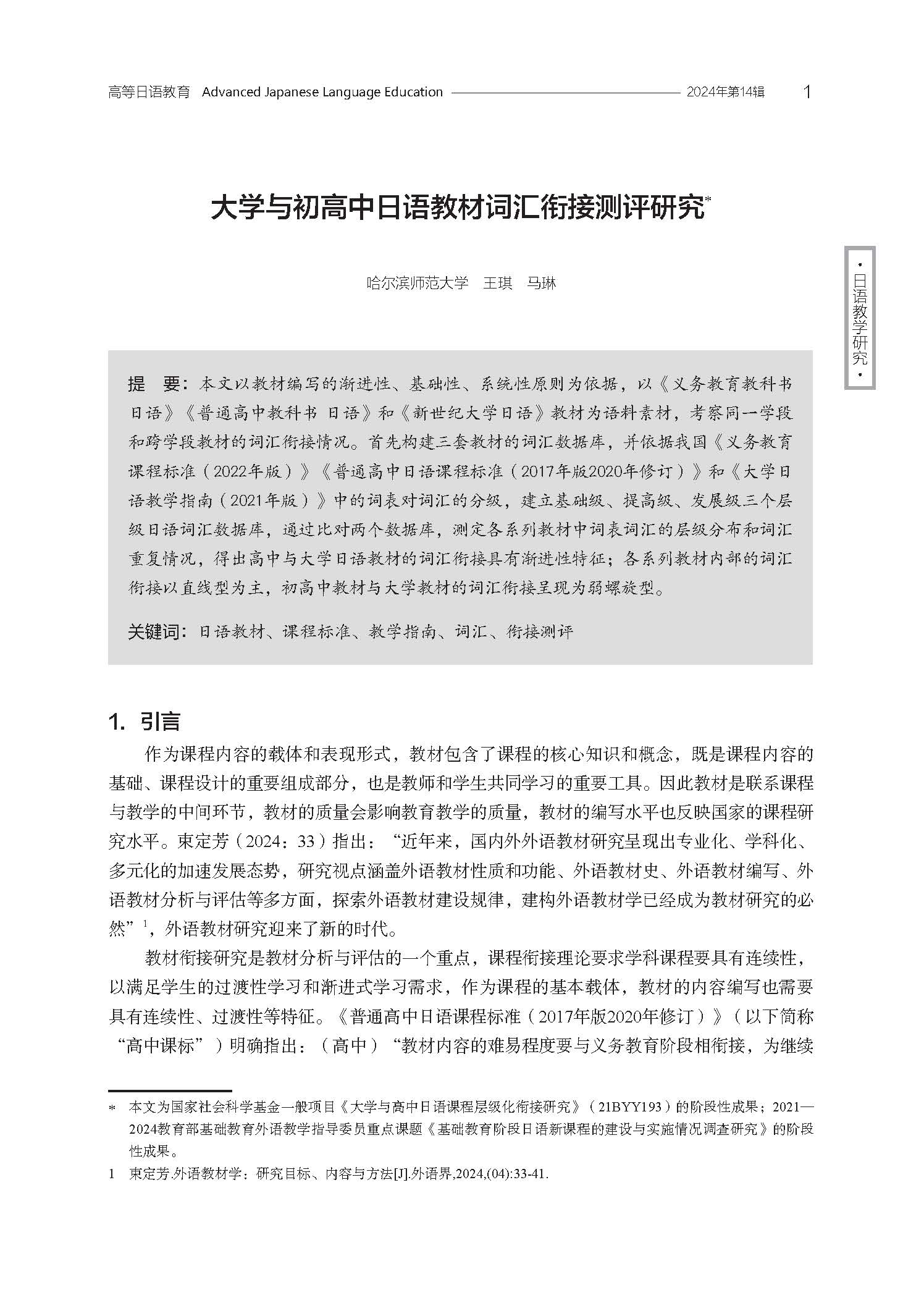 《高等日语教育(第14辑)》收录13篇日语研究方面的学术论文,日语学术界中坚力量的学者所撰写的具有学术前沿动态和学术价值的论文集结出版,力求学术性和专业性并举,实现与国内语言学界的融通对接、振兴日语研究。促进日语研究与普通语言学及其国内其他语言的研究的融合、接轨。《高等日语教育》入选中国人文社会科学学术集刊AMI综合评价入库期刊。本刊内容也已在《中国学术期刊网络出版总库》及CNKI系列数据库中上线。