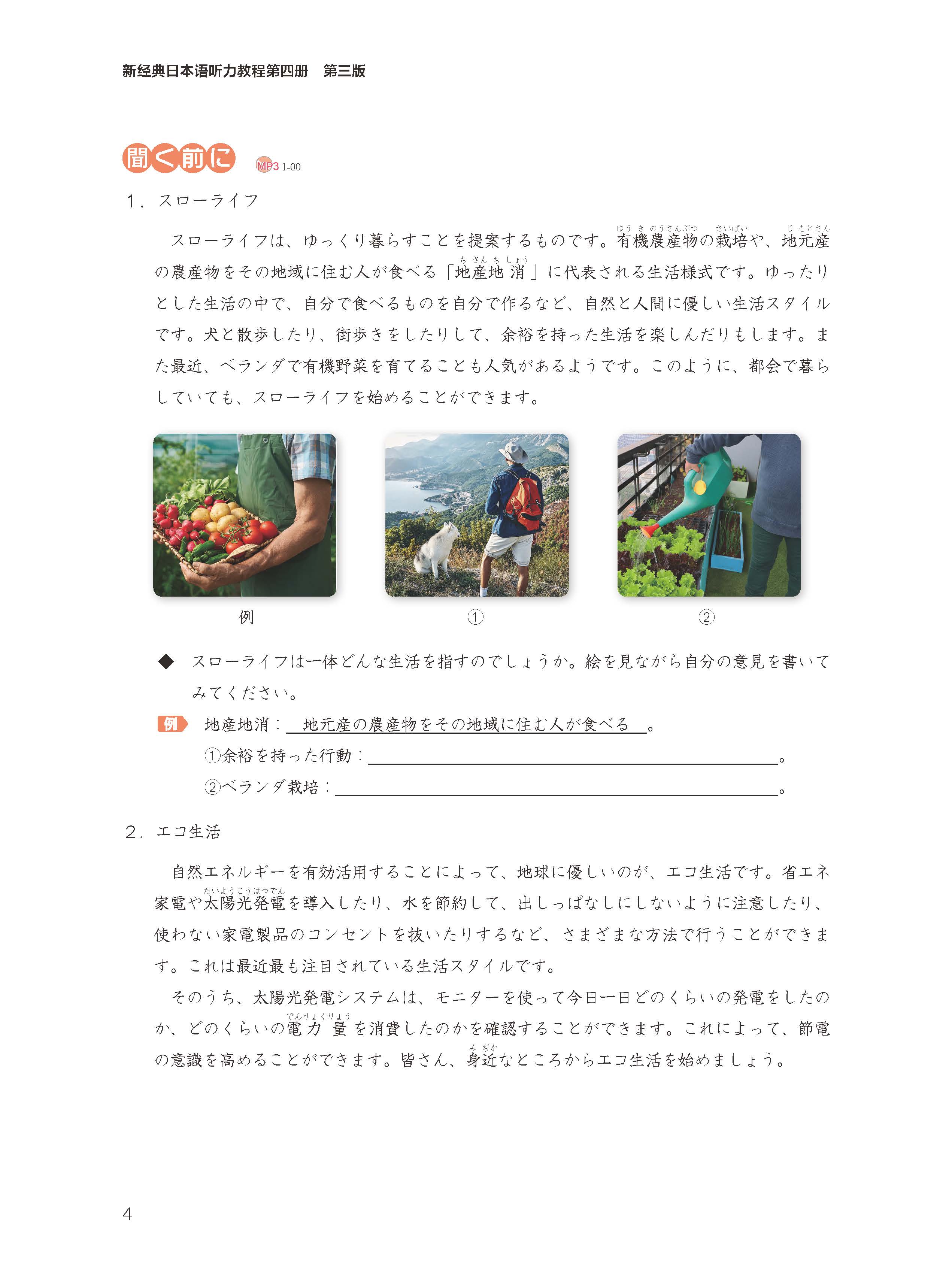 《新经典日本语听力教程第四册(第三版)》是日语专业二年级第2学期的听力课程用书,全书共16课,第1课~第15课主要为话题型听力专项训练,第16课为综合测试。