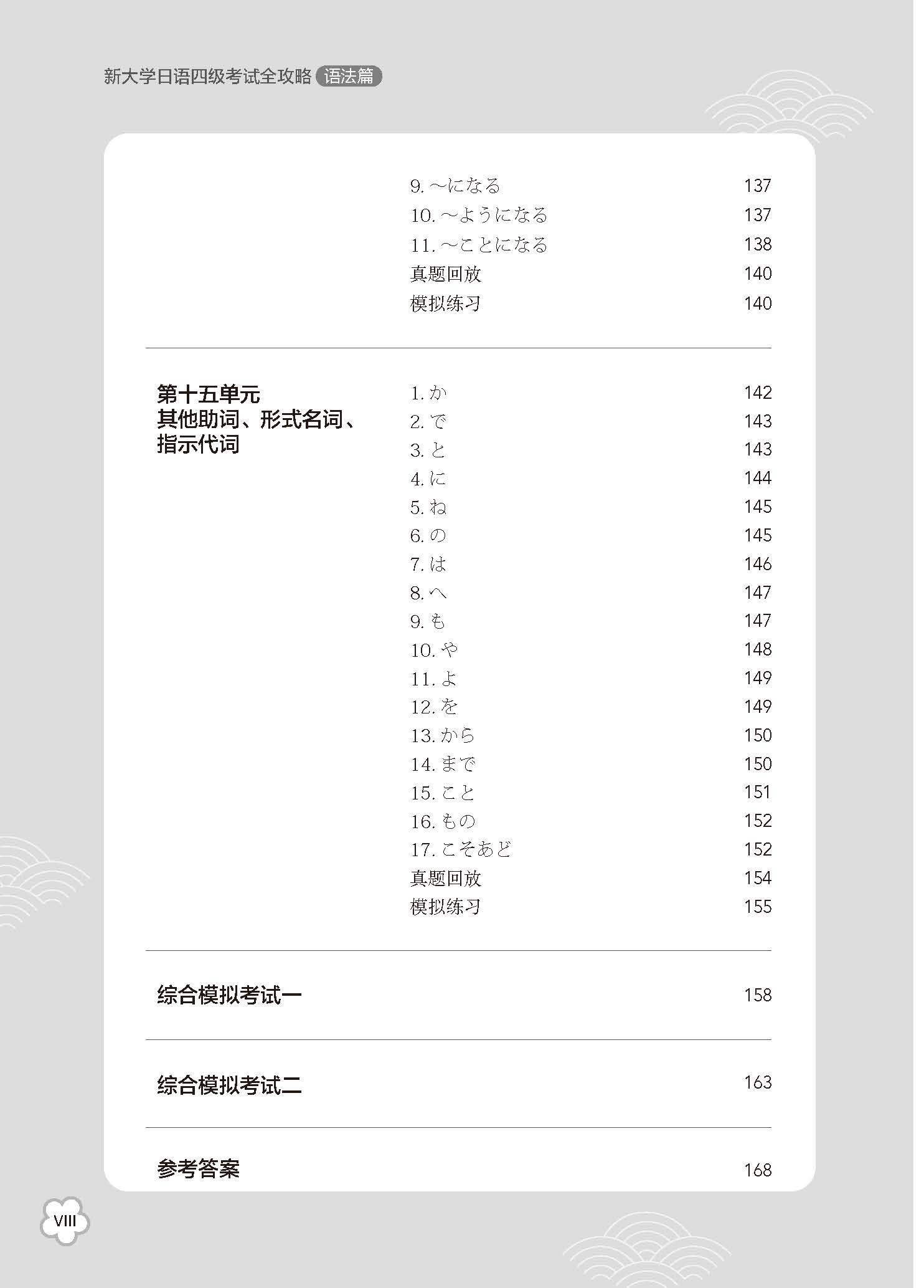 《新大学日语四级考试全攻略语法篇》为《新大学日语四六级考试系列》的语法分册,稿件严格按照《全国大学日语四、六级考试大纲(2023年版)》编写。根据语法功能,将新考纲中的语法条目科学分类,每个主题后都配有语法释义、日文接续讲解、大量真题、模拟题。在特别单元中总结高中日语的基础知识点,衔接高中阶段语法知识。最后配有两套模拟试题,学练结合,助力考生短时间内高效提高语法能力。