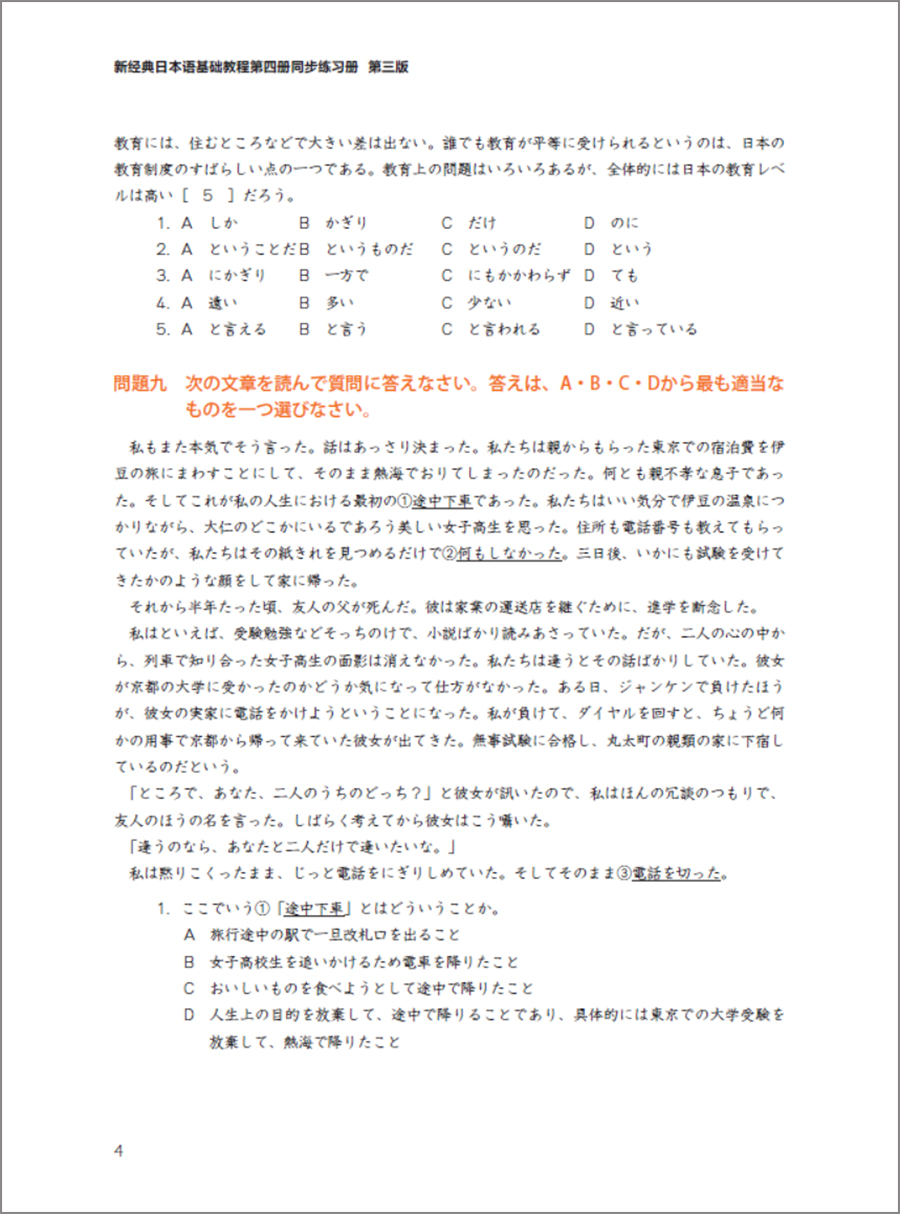 《新经典日本语基础教程第四册同步练习册:第三版》是《新经典日本语基础教程第四册:第三版》的配套练习册。书中所有的练习内容均围绕主教材中出现并要求掌握的知识点进行设计与编写,目的是补充、巩固和强化所学知识。