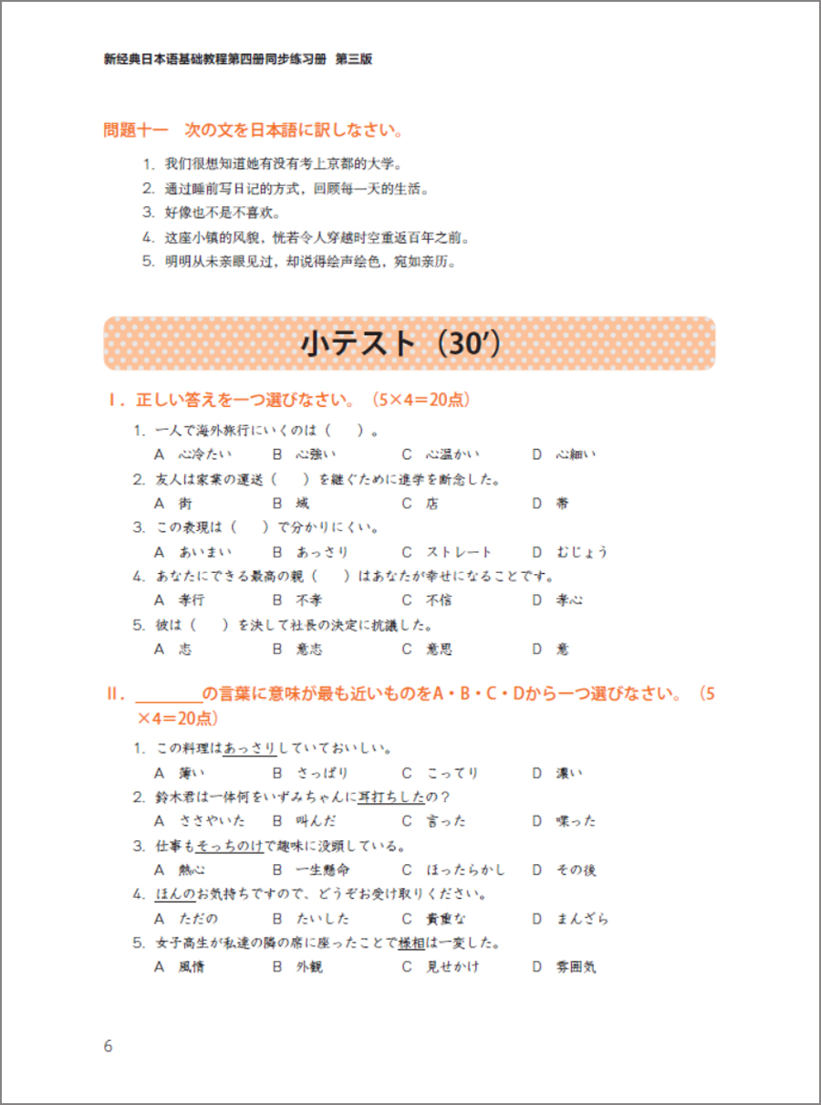 《新经典日本语基础教程第四册同步练习册:第三版》是《新经典日本语基础教程第四册:第三版》的配套练习册。书中所有的练习内容均围绕主教材中出现并要求掌握的知识点进行设计与编写,目的是补充、巩固和强化所学知识。