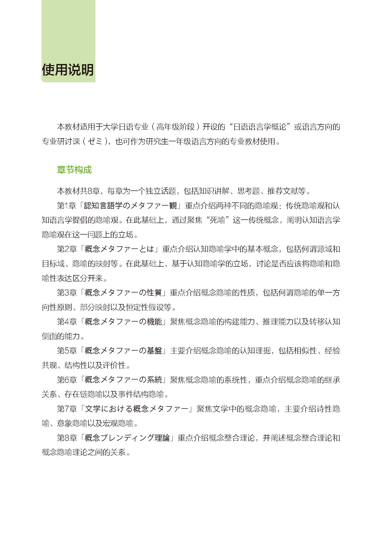 《日语认知隐喻学概论》适用的课程包括大学日语专业三年级或四年级的专业选修课(专业方向课)或面向研究生一年级开设的语言专业类课程。本教材注重知识的系统性,涵盖认知隐喻学的核心概念和几个重要议题,以帮助学生更好地理解和掌握认知隐喻学的基本理念;注重例句的趣味性,尽可能挑选一些具有启发性且饶有趣味的例句,从而引发更加深入的思考;注重语言的易读性,在行文上采用通俗易懂的です/ます体,便于学生自学和教师直接用日语授课。