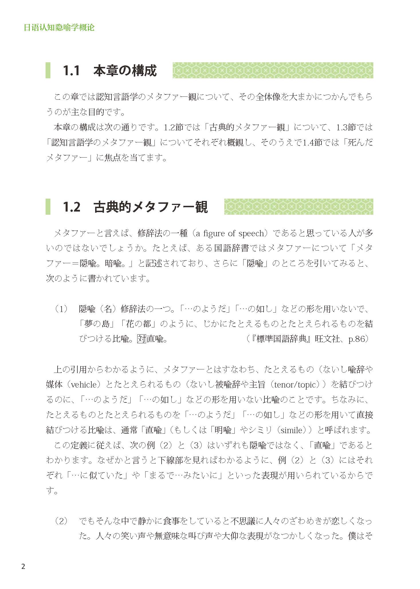 《日语认知隐喻学概论》适用的课程包括大学日语专业三年级或四年级的专业选修课(专业方向课)或面向研究生一年级开设的语言专业类课程。本教材注重知识的系统性,涵盖认知隐喻学的核心概念和几个重要议题,以帮助学生更好地理解和掌握认知隐喻学的基本理念;注重例句的趣味性,尽可能挑选一些具有启发性且饶有趣味的例句,从而引发更加深入的思考;注重语言的易读性,在行文上采用通俗易懂的です/ます体,便于学生自学和教师直接用日语授课。