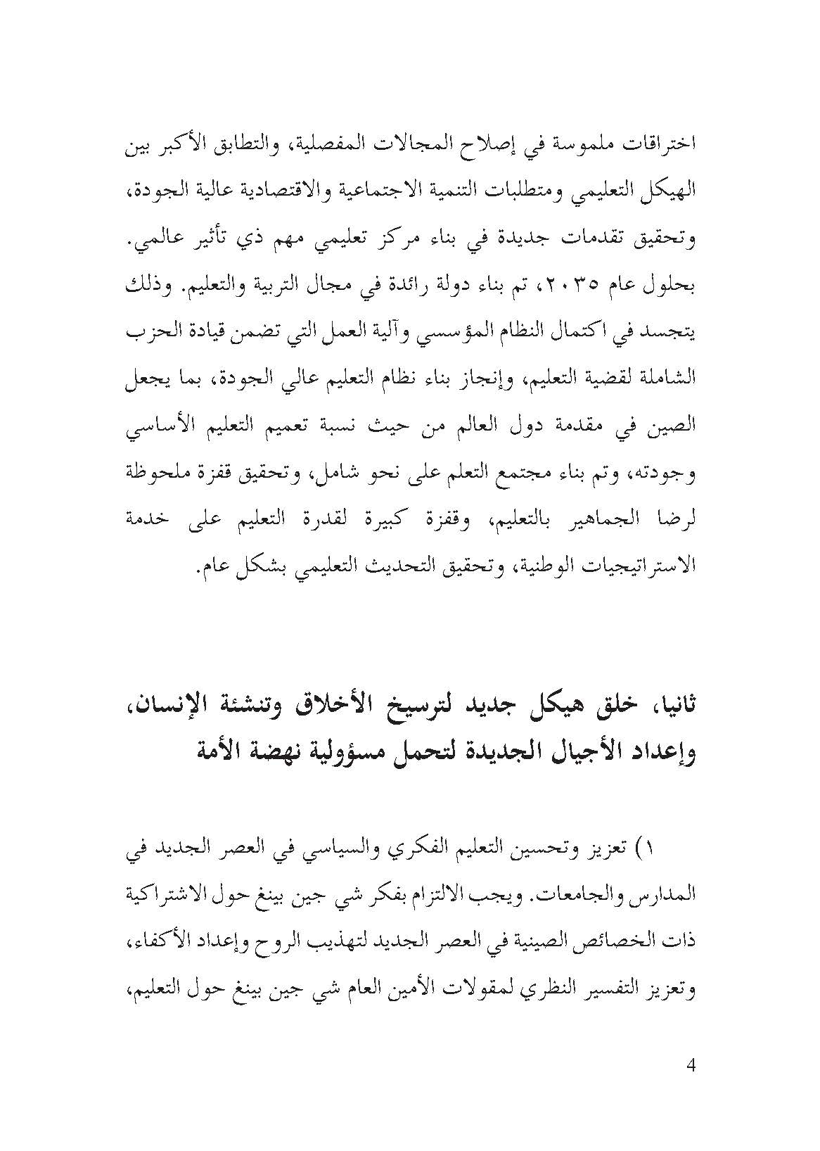 《教育强国建设规划纲要(2024-2035年)》(阿拉伯文版)共11个部分,以习近平新时代中国特色社会主义思想为指导,深入贯彻全国教育大会精神,紧扣中央关心、群众关切、社会关注,坚持目标导向、问题导向和效果导向,紧紧围绕教育的“三大属性”,以“六大特质”为主要特征、以“八大体系”为基本结构、以正确处理“五个重大关系”为关键要求,将深化改革贯穿全文,突出教育科技人才一体统筹部署,推出一系列创新举措,推动从教育大国向教育强国的系统跃升。