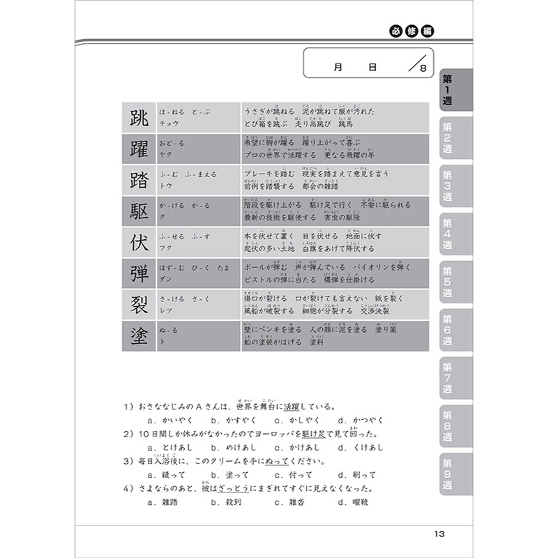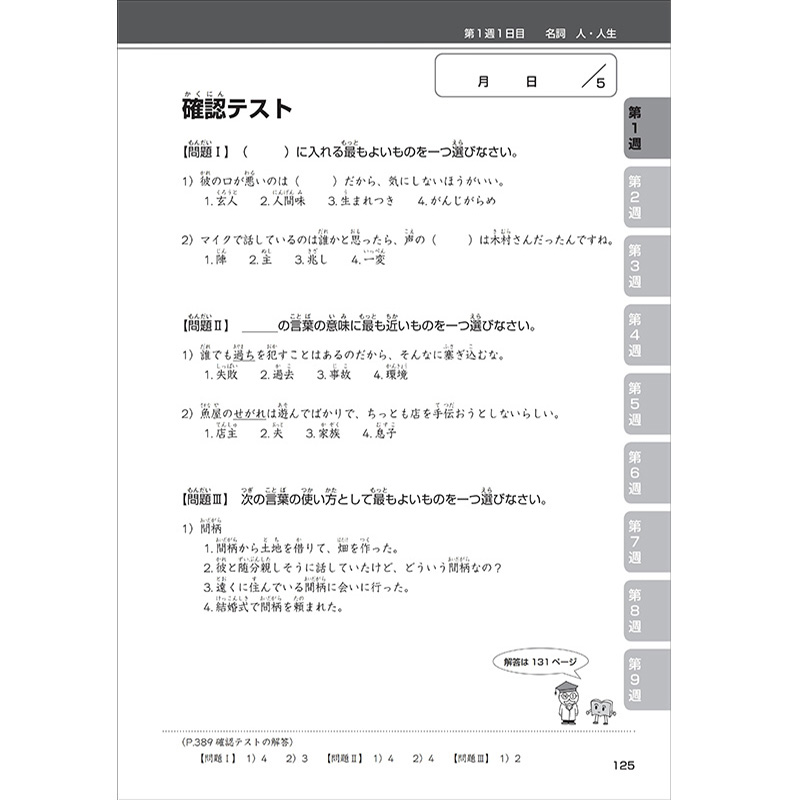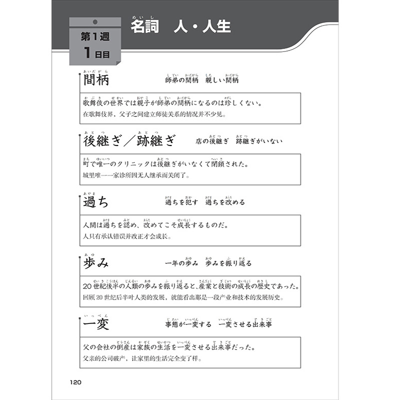 《新日语能力考试对策文字词汇N1》以掌握新日语能力考试N1级别中出现的文字、词汇为练习目的,适用于想通过新日语能力考试N1级别的学习者及想赴日工作的学习者。本书既可作为N1文字、词汇的备考用书,也可作为提高自身实际语言运用能力的辅助材料和检测材料,帮助学习者全面综合提升日语语言技能。本书依据N1级别单词总量,将任务细化到每一天。“文字词汇”细化为“文字篇”和“词汇篇”,按照“必学单词→熟练单词→难读单词”的顺序安排背诵、学习、测试,让学习者在9周时间内完成每天2页文字练习、6页词汇练习,直接通过实战记忆,达到科学复习、高效复习的目的。书后附有汉字、词汇核查表,学习者可以对自己的学习效果进行确认。