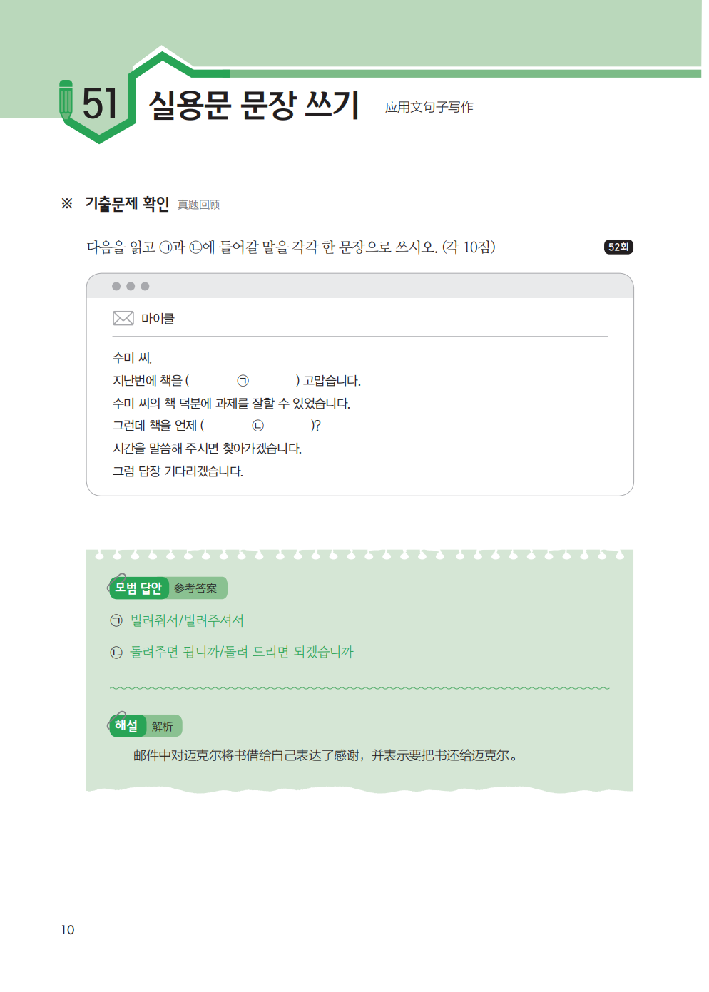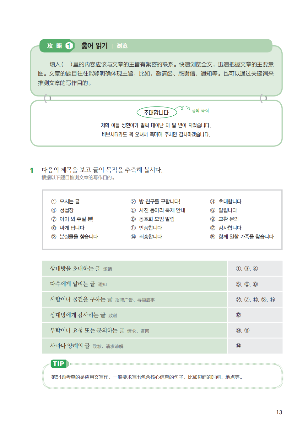 《新韩国语能力考试写作必备中高级》主要针对能考中的写作部分,也就是第51-54题进行了详细讲解。题型解析帮助考生准确理解题型,为备考指明方向。书中结合真题详细介绍了针对每一个题型的解题攻略,即便是连母语写作都不是很擅长的学生,也能通过学习攻略在能考写作部分中取得相对理想的分数。另外,书中还提供了模拟试题,让学生能够随学随练,通过实战更加准确地把握题型,更加扎实地掌握解题技巧。错误使用阶称和语体是写作中经常出现的错误,书中按照题材类型对正确的阶称和语体的用方法进行了详细的说明,并归纳出了比较典型的、常见的错误。除此之外,书中的名师写作技巧板块对写作中常用的近义词、反义词、典型句型,以及同一种含义的多种表达方式都进行了分类总结,从多个角度帮助考生提高写作能力。