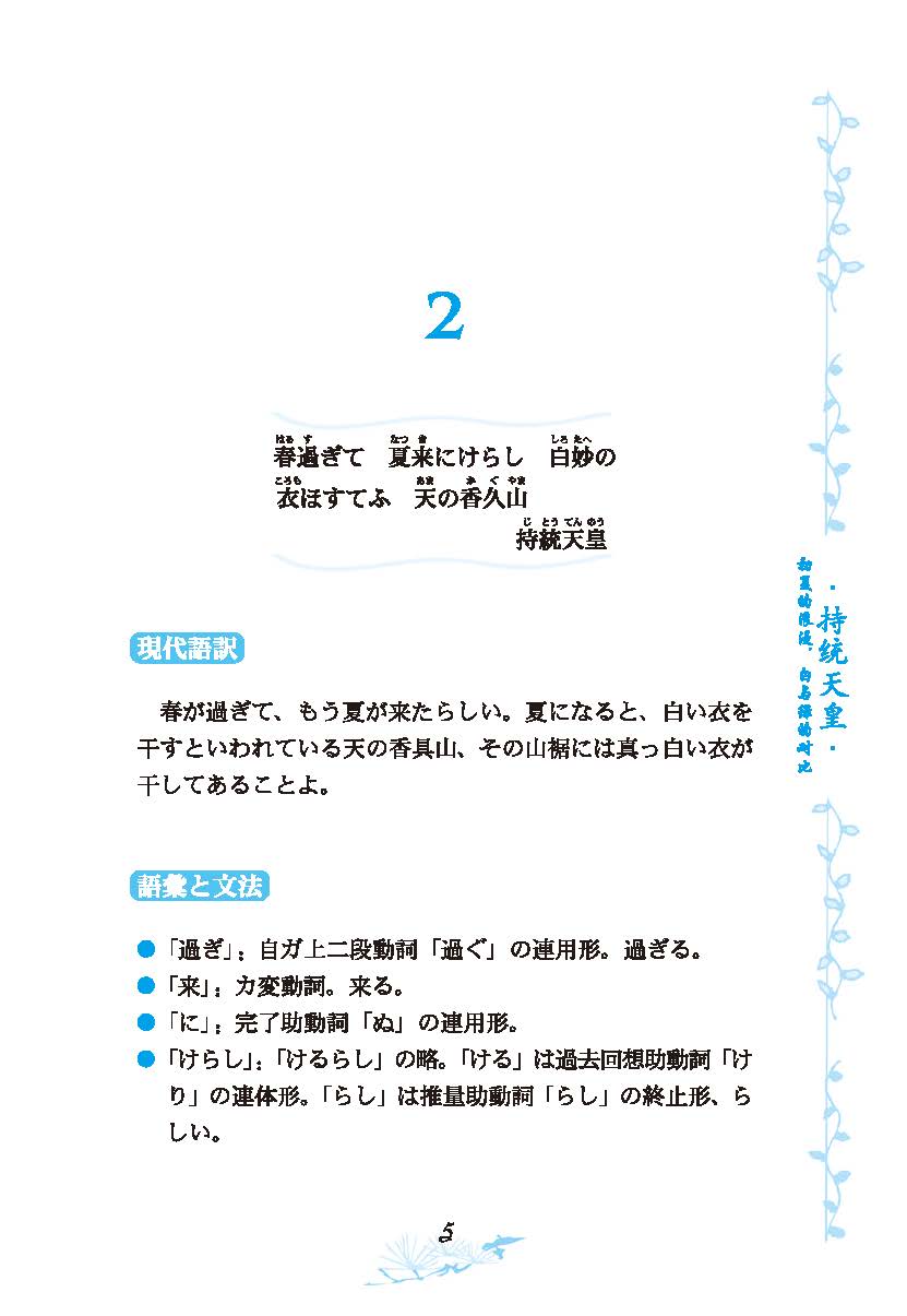 和歌是日本民族值得自豪的诗歌艺术,也是人类文化遗产中绚丽多彩的花朵。而《小仓百人一首》则是和歌的代表之作,它汇集了日本古代七百年间百位一流诗人的名歌,是日本最广为流传的和歌选集。本书将这一百首和歌分别译成了日语现代文、中文五言诗、中文散文诗,并加入语法讲解、作者简介和诗歌鉴赏,让读者能真正理解和领悟到和歌这一日本传统文化的精髓,诗文中优美的版画式插图也能让读者进一步感受到日本传统文化的魅力。