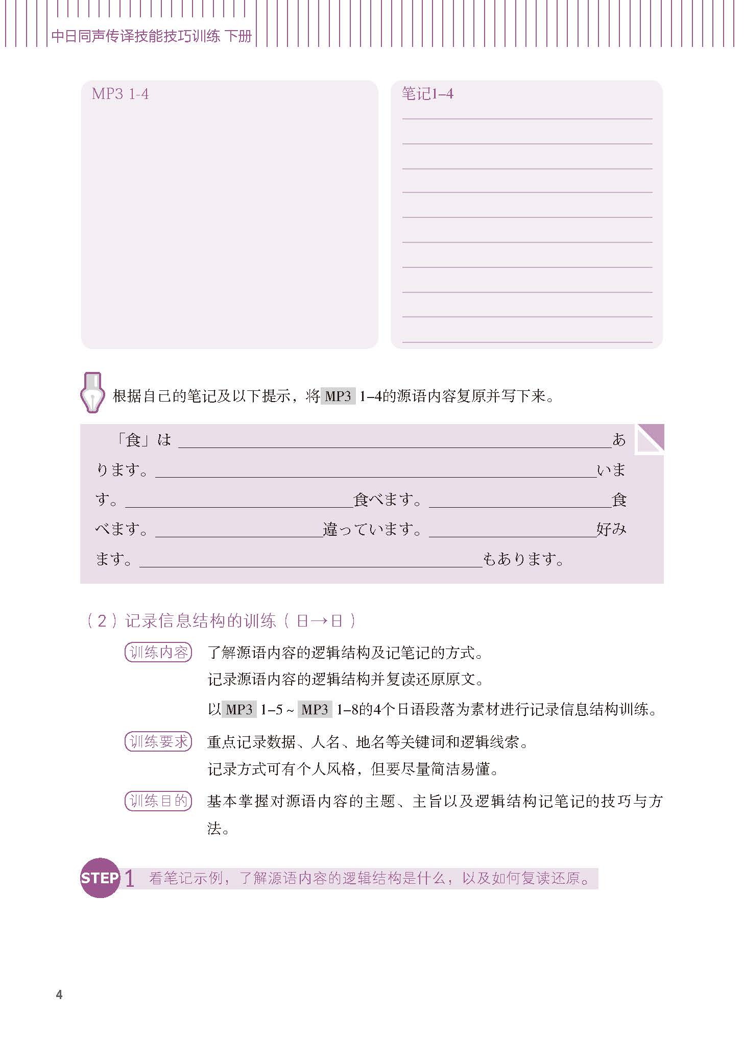 《中日同声传译技能技巧训练下册》以同声传译训练中的技能技巧训练为主线,内容涵盖语音、听力、跟读、复述、概括、转述、公众演讲、快速反应、无笔记交传等技能技巧训练,以及交替传译、视译、同声传译等融口译技能技巧为一体的不同口译形式的综合训练。训练过程包括中译日与日译中。通过科学的、有逻辑性的专业训练,在夯实口译技能技巧的基础上,帮助学习者循序渐进地了解并把握交替传译、同声传译及相关口译形式的内容、特点及操作过程。与此同时,训练中在不断提升实际操作能力的前提下,力求拉近口译训练与口译实践之间的距离,提高学习者的实战能力。