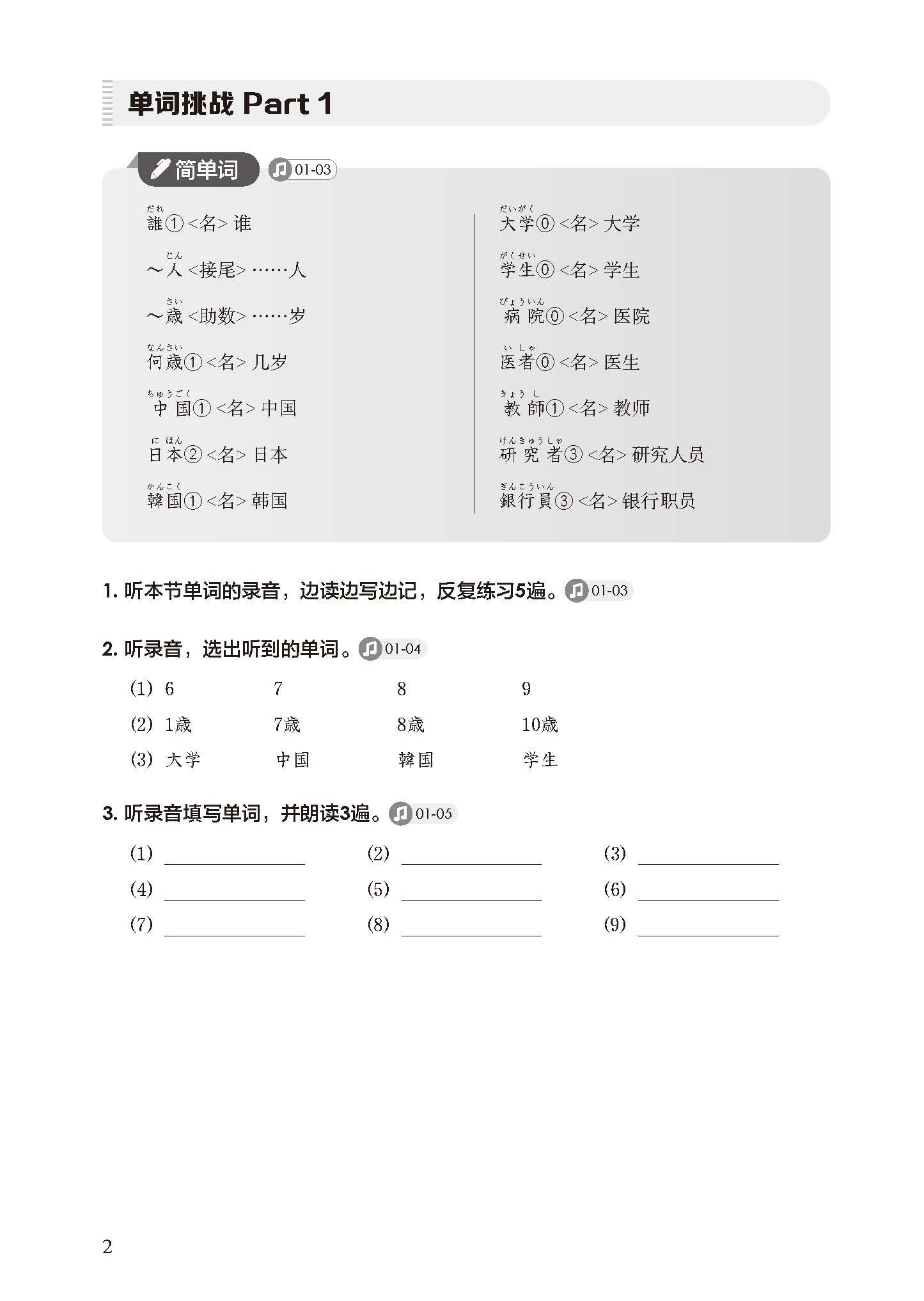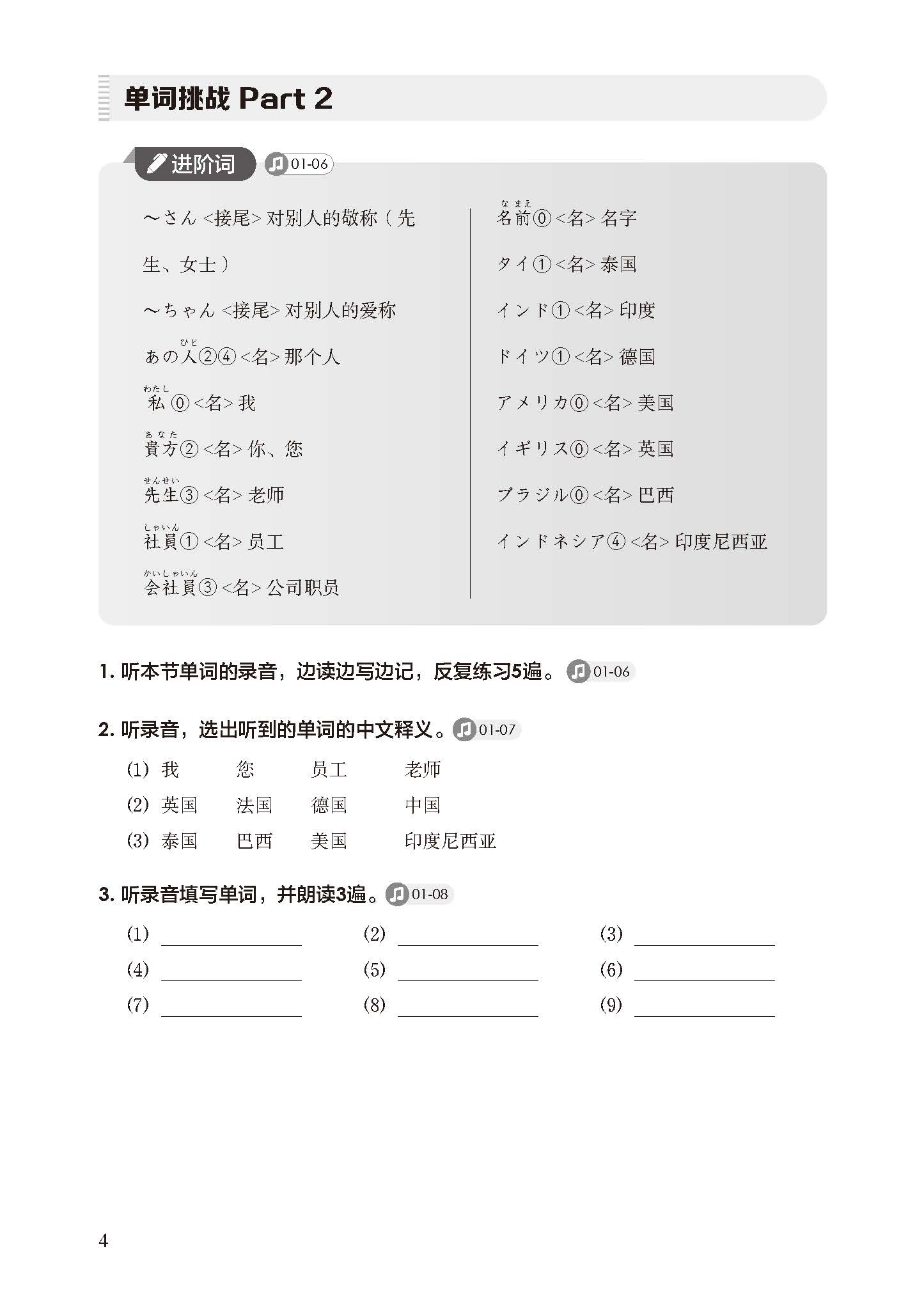 在特定的学习阶段,本书设置了思维拓展和写作练习板块,旨在引导学有余力的学生进行更高层次的训练,满足不同学习者的需求。此外,部分题型采用与日本语能力测试相同的题型,帮助学习者在学习过程中适应日本语能力测试。