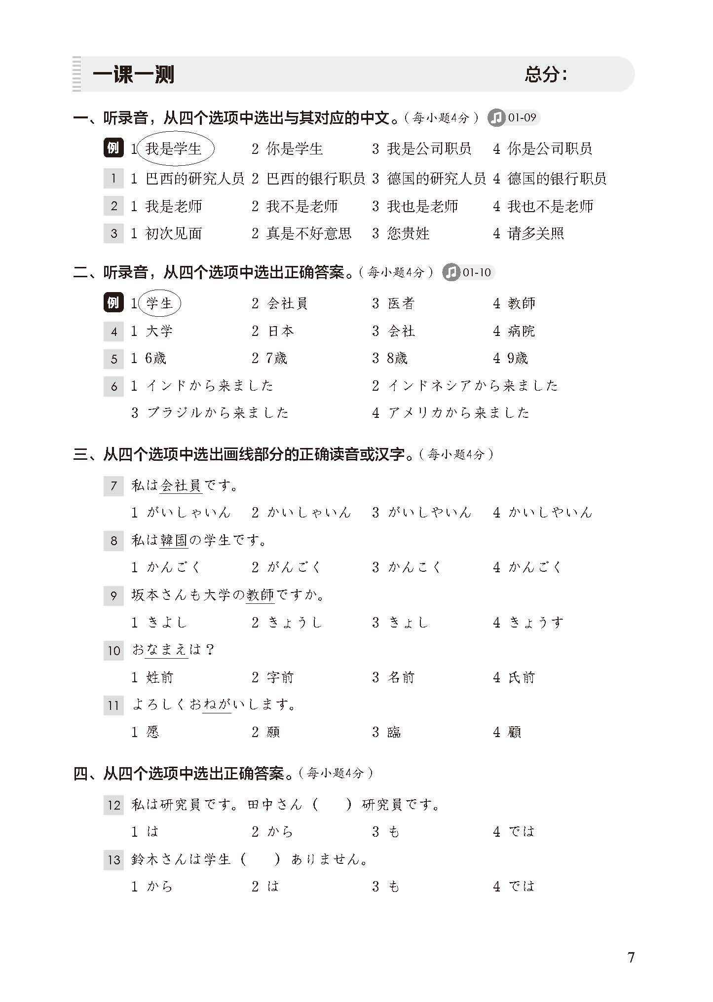 在特定的学习阶段,本书设置了思维拓展和写作练习板块,旨在引导学有余力的学生进行更高层次的训练,满足不同学习者的需求。此外,部分题型采用与日本语能力测试相同的题型,帮助学习者在学习过程中适应日本语能力测试。