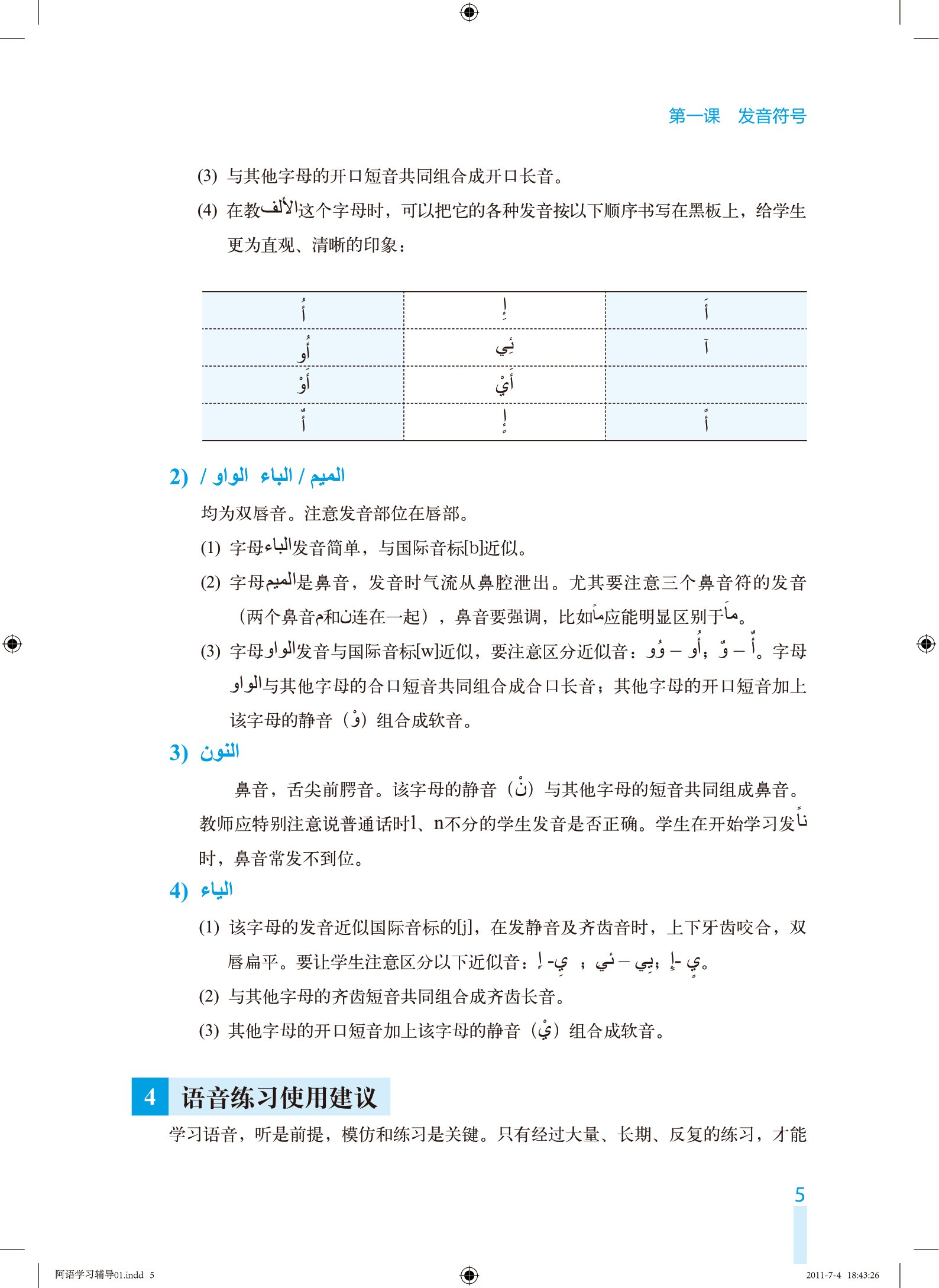 《新编阿拉伯语(教师用书)》除教学法指导外,还包括与主教材相对应的24课的内容、语音验收样卷、综合练习卷及参考答案等内容。与语音阶段课文对应的部分主要包括教学目的、字母发音、语音练习使用建议等内容。课文阶段主要包括教学目的、预习要求、教学内容、教学重点、教学难点等内容。本书内容丰富,指导具体,相信通过使用本套教师用书,可以引导教师更好地使用《新编阿拉伯语》这套教材,能够在阿拉伯语教学中化繁为简,引导学生发现阿拉伯语的特点、总结规律、养成良好学习习惯,以使学生提升学习能力,并提高学习效率。