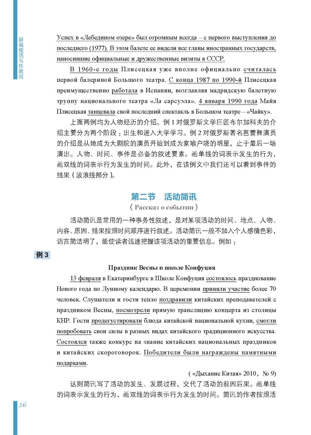 《新编俄语写作教程》是高等学校俄语专业教材。该教材共五个单元,包括描写、叙述、议论、信息处理训练及俄语专业四、八级水平测试写作训练等内容,配有大量实例、思考题和专项练习,为写作者提供针对性较强的学习平台,旨在培养思维能力和表达能力,启发学习者在写作实践中有意识地运用相关理论组织话语。提供历年八级写作真题样文及点评分析,并配有八级口语表述的样文供参考;注重操练型和指导型写作训练模式的作用,以写作理论为原则帮助学生评估其写作效果。