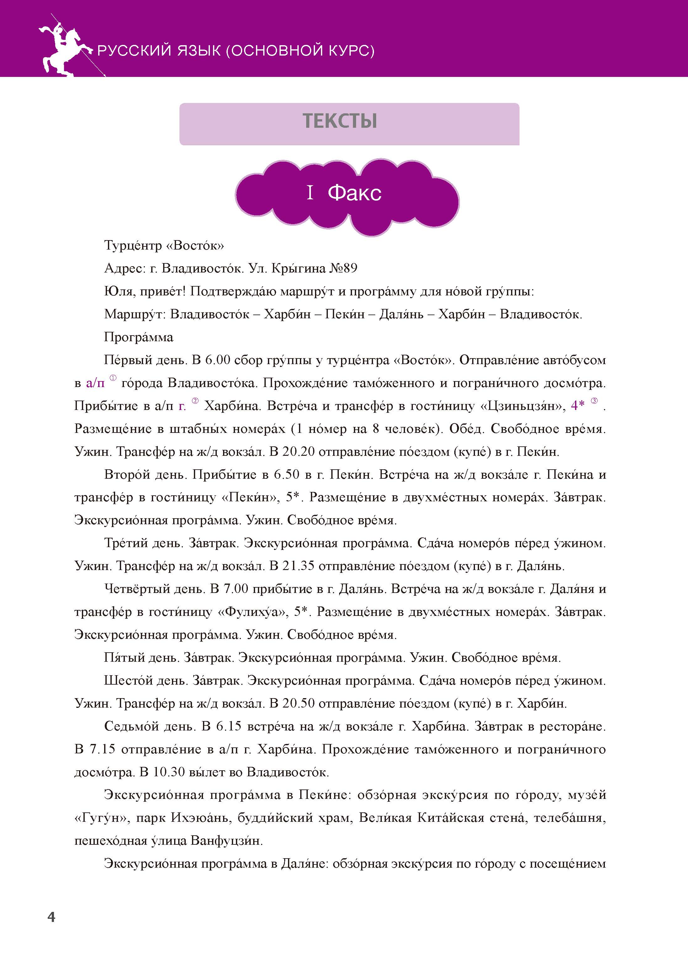 《旅游俄语基础教程4》教材主要内容是语法、会话、课文。会话偏重讲解俄语旅游生活会话,课文讲述中国游客在莫斯科、索契、伊尔库茨克、哈巴、弗拉基沃斯托克等地游览,着重交通、旅游景点、饮食等方面,俄罗斯游客来中国哈尔滨、北京、昆明、桂林、澳门、香港、重庆等地,着重建筑、中医、气功、民间艺术、节日、旅游景点等方面。语言地道,内容有趣味性,讲述得简单、活泼。