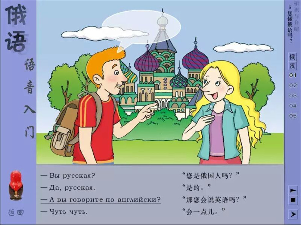 《我的第一本俄语语音》既适合高等学校俄语专业零起点的一年级学生使用,也可作为俄语初学者的自学教材,还可帮助有一定基础的俄语学习者改善语音学习的质量。教材包括纸质课本和多媒体软件两部分。纸质课本共7课,每课均包含字母、音位、语调、语音操、练习与游戏、诗歌与游戏等6个部分。其中对元音、清浊辅音、元音弱化、软硬辅音等语音现象作了较系统的梳理,并为学生使用多媒体光盘提供了学习策略。多媒体软件则创设了更加自由灵活的学习环境,学生可以自主选择学习内容与练习方式。除了上述6个部分以外,软件中还增加了单词表,收入了常用单词923个;“练习与游戏”部分增加了拼图组词和听音练习,内容与形式都更加丰富有趣、更具互动性。